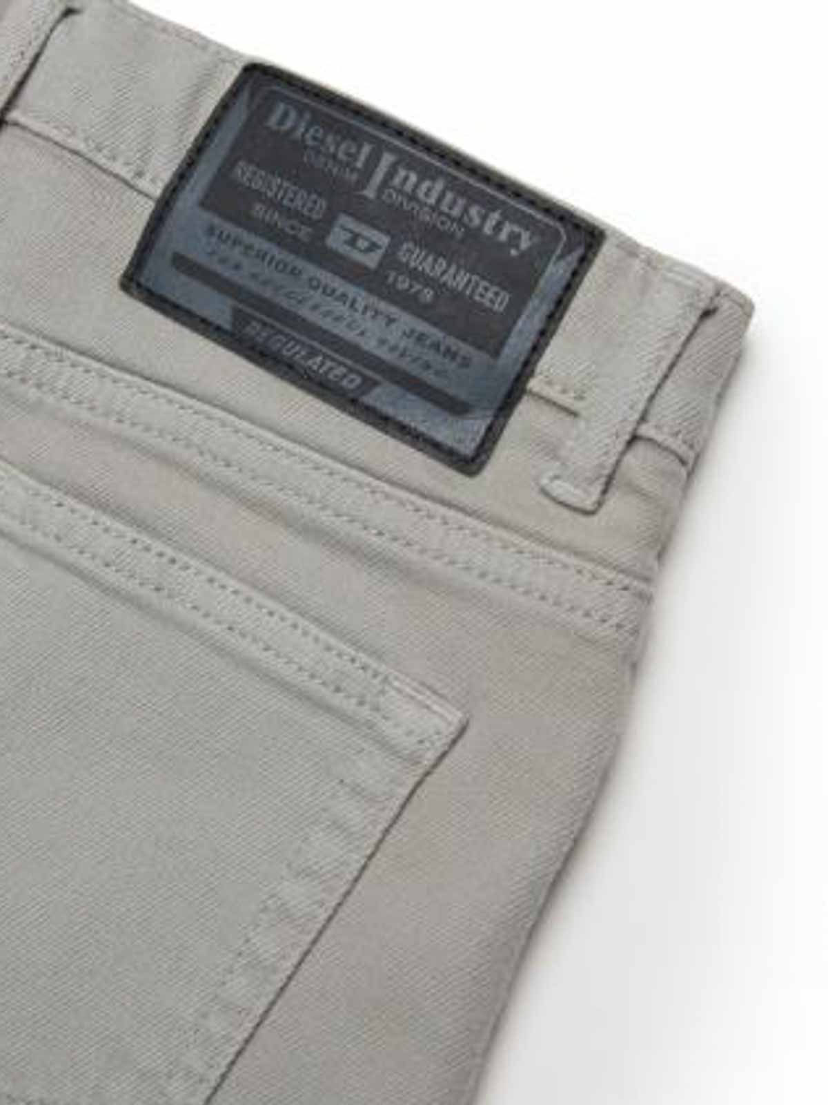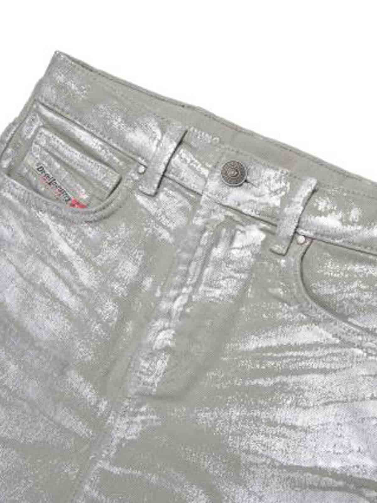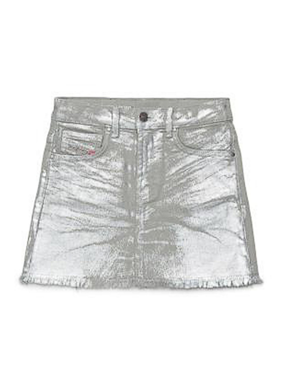 フリンジ付きの裾のミニスカートはライトグレーが特徴/ボタン付きのポケット5つ、後ろの裾にはジップロゴ付き、フリンジ付き裾はラミネート仕上げ