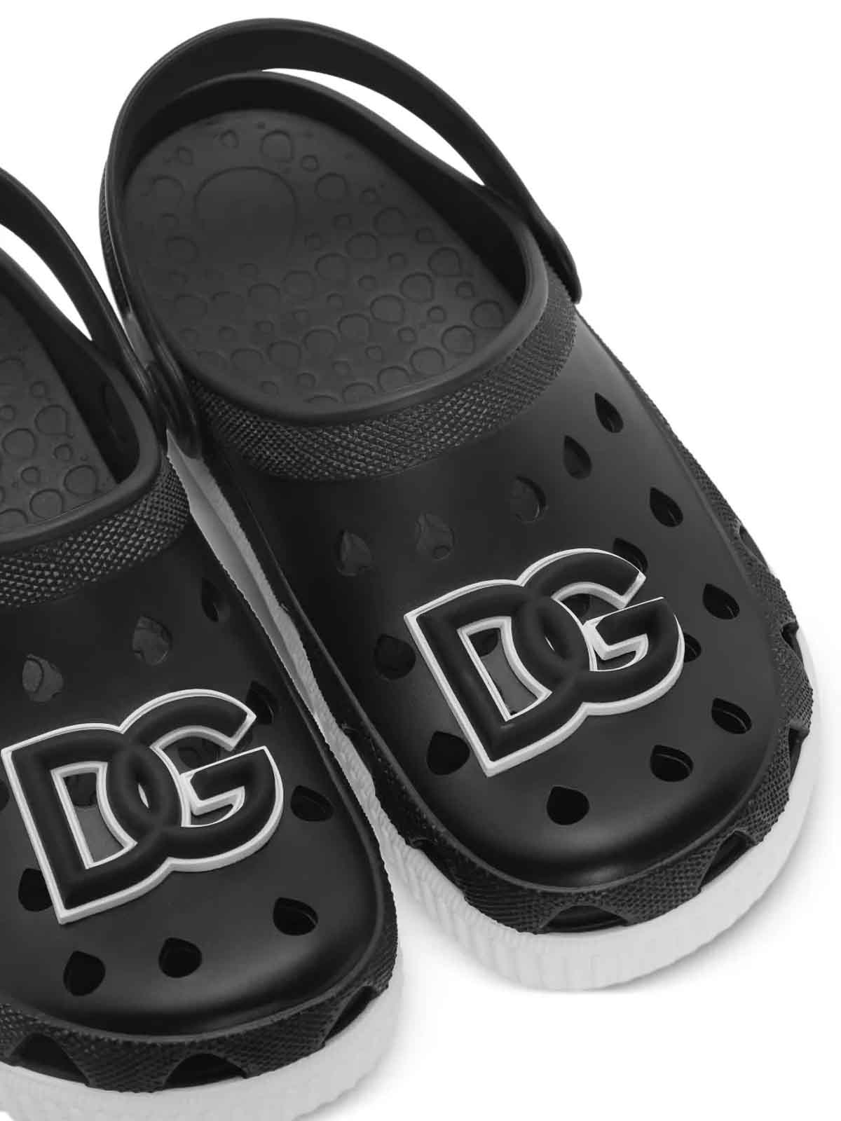 黒のアプリケーションロゴ入り穴あきデザイン溝付きバックストラップ付きサンダル
