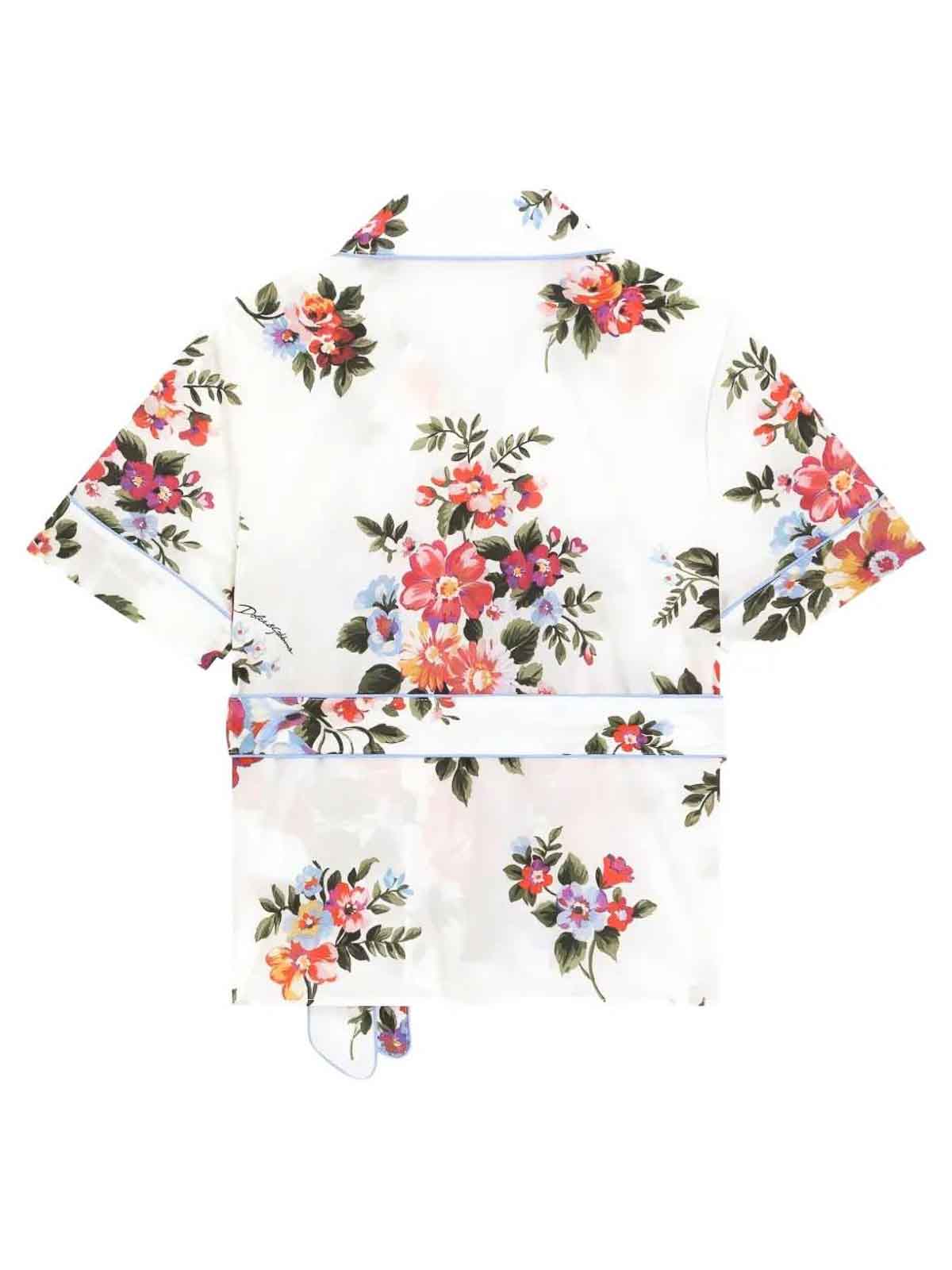 白い花柄のシャツ、先のとがった襟、半袖、フロントノットとボタン付きベルト