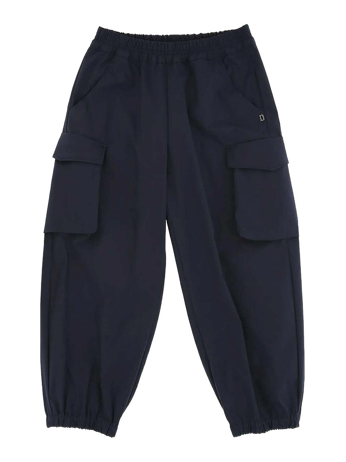 ブルーの伸縮性ウエストバンド、サイドカーゴポケット、伸縮性のあるアンクルヘム