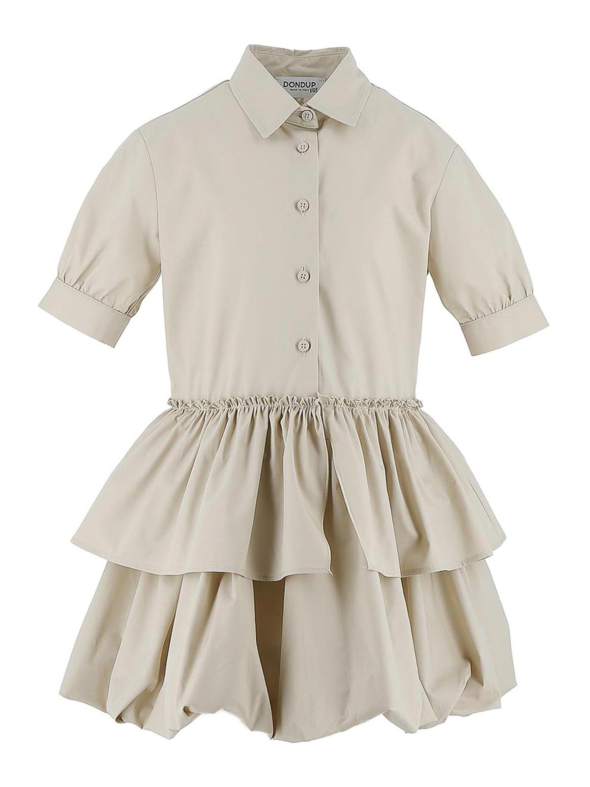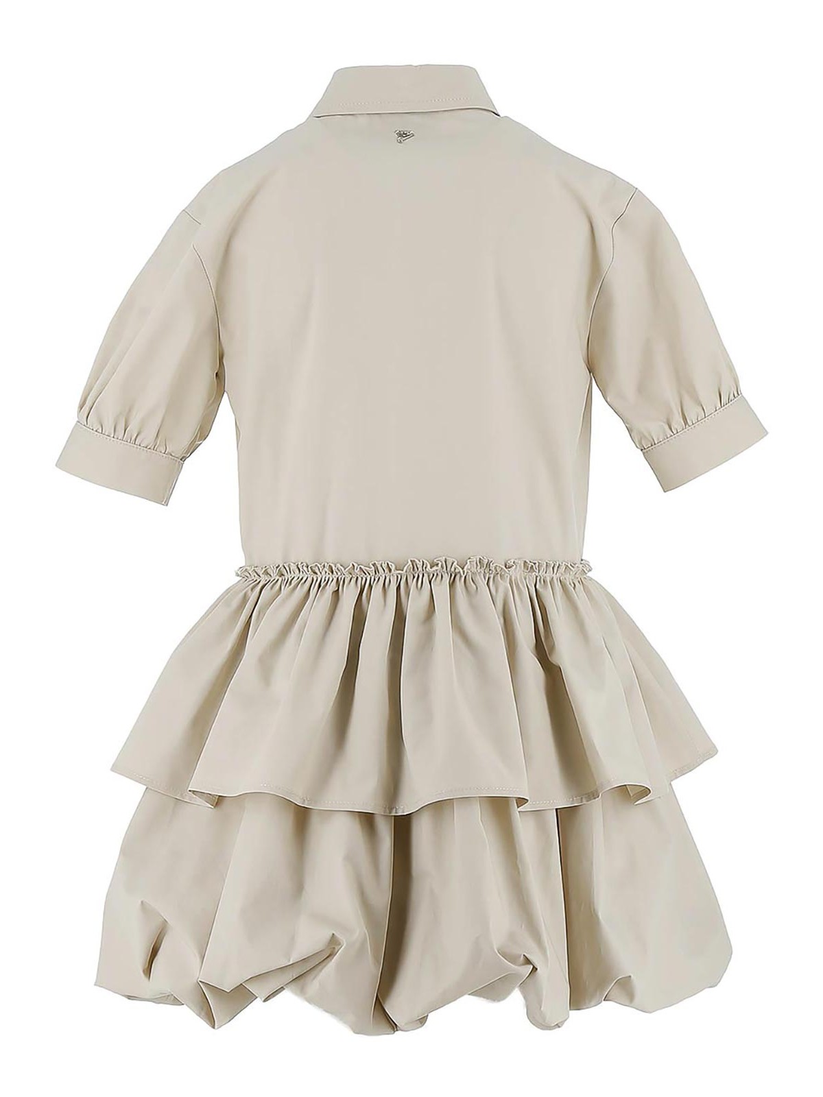フリル付きドレスベージュデザインフリル付きスカート半袖ポインテッドカラーフロントボタンフリル付き