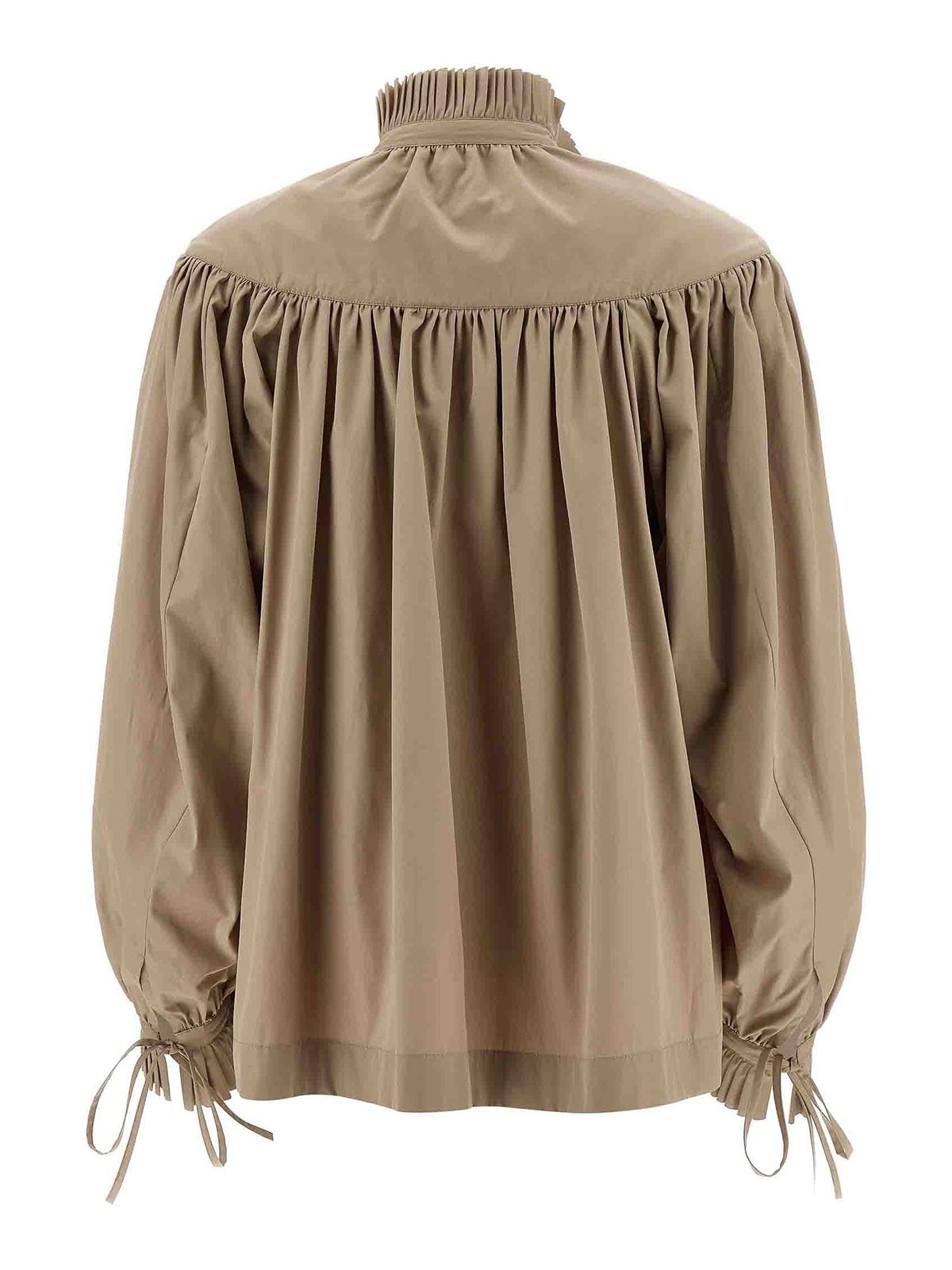 Catya'のカール付きコットンポプリンシャツ、フレアシルエット、プリーツ付きハイネック、ネクタイレース付きVネック、プリーツカフスとドローストリング付きロングスリーブ。