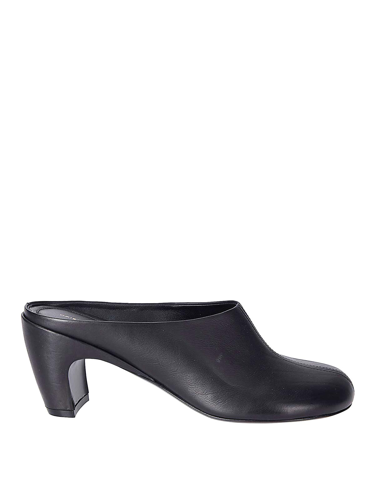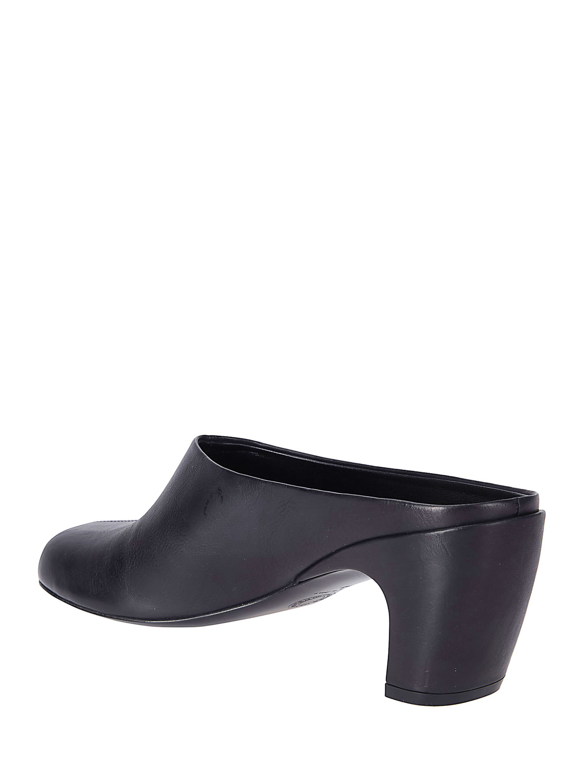 ローヒール、ラウンドトウ、フロントシームのレザーミュール。