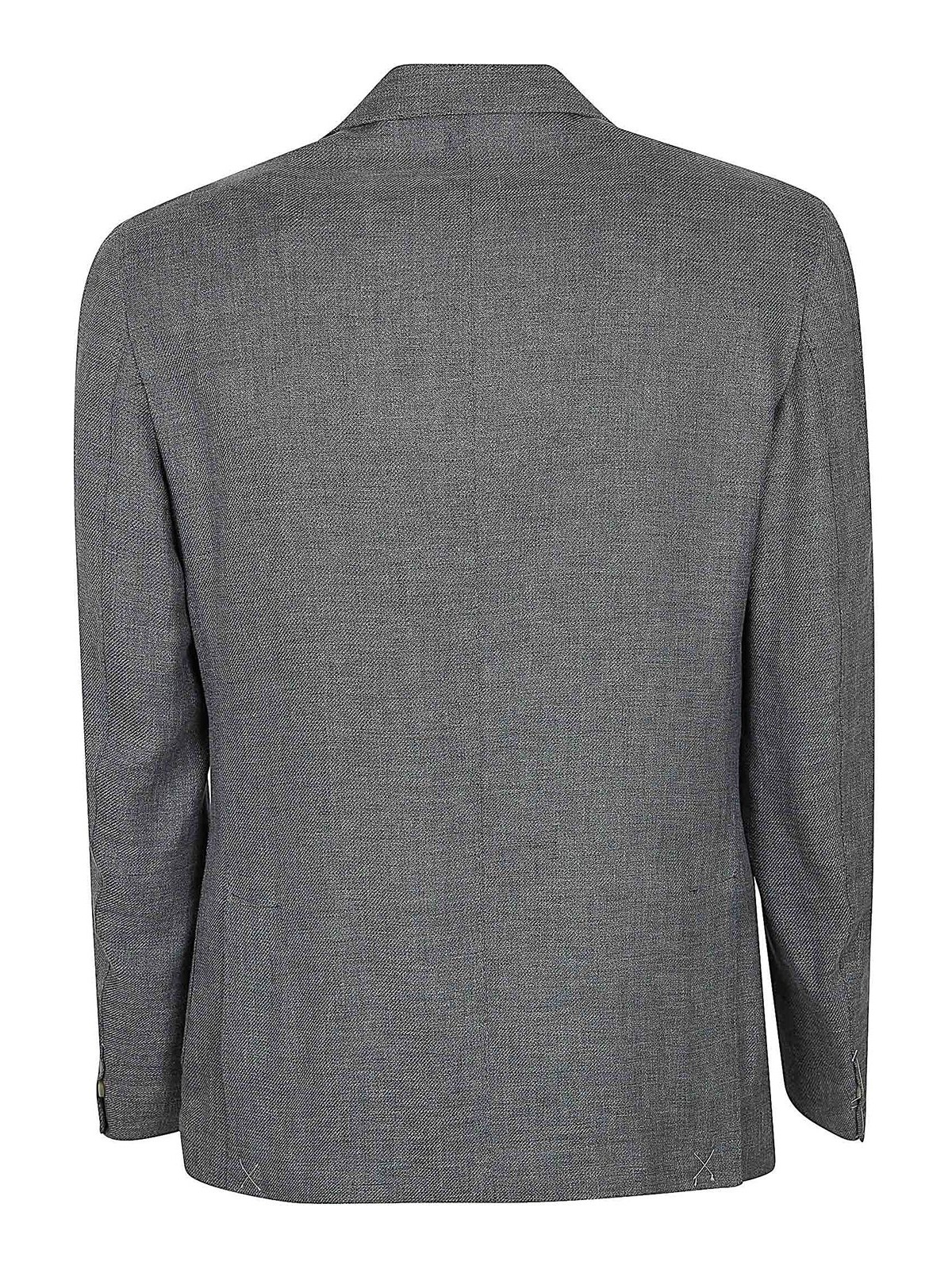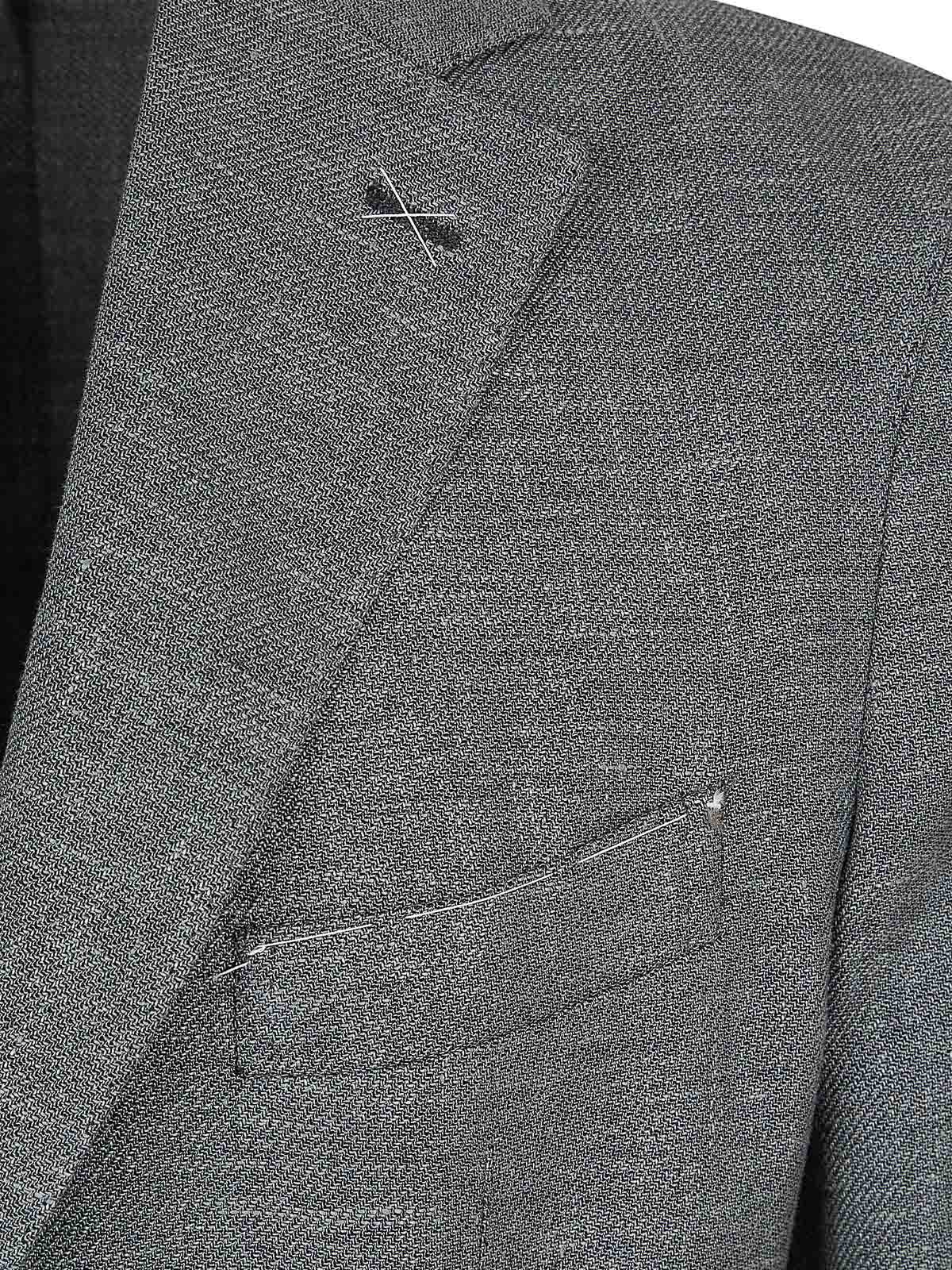 リネンとエレバンティスーツのシングルブレストジャケット、ボタン2つ、パッチポケット2つ、ウェルトポケット1つ、ウエストにゴムとドローストリングが付いたパンツ、ジッパーとボタン付きのズボン、斜めポケット2つ、背面にフラップとボタンが付いたウェルトポケット2つ、ダブルプリーツ付き