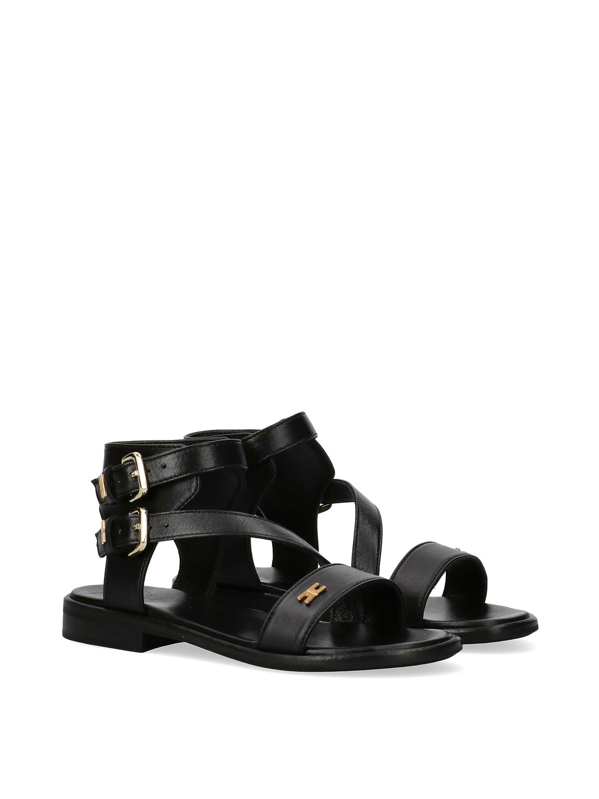 フロントにロゴをあしらい、足首にダブルバックルクロージャーをあしらったブラックサンダル
