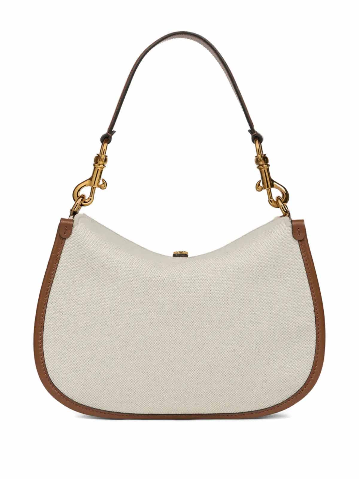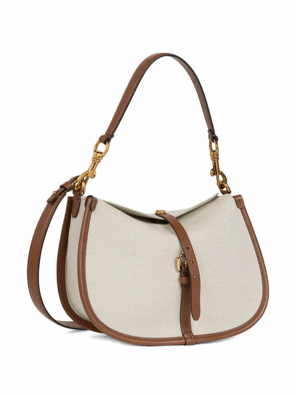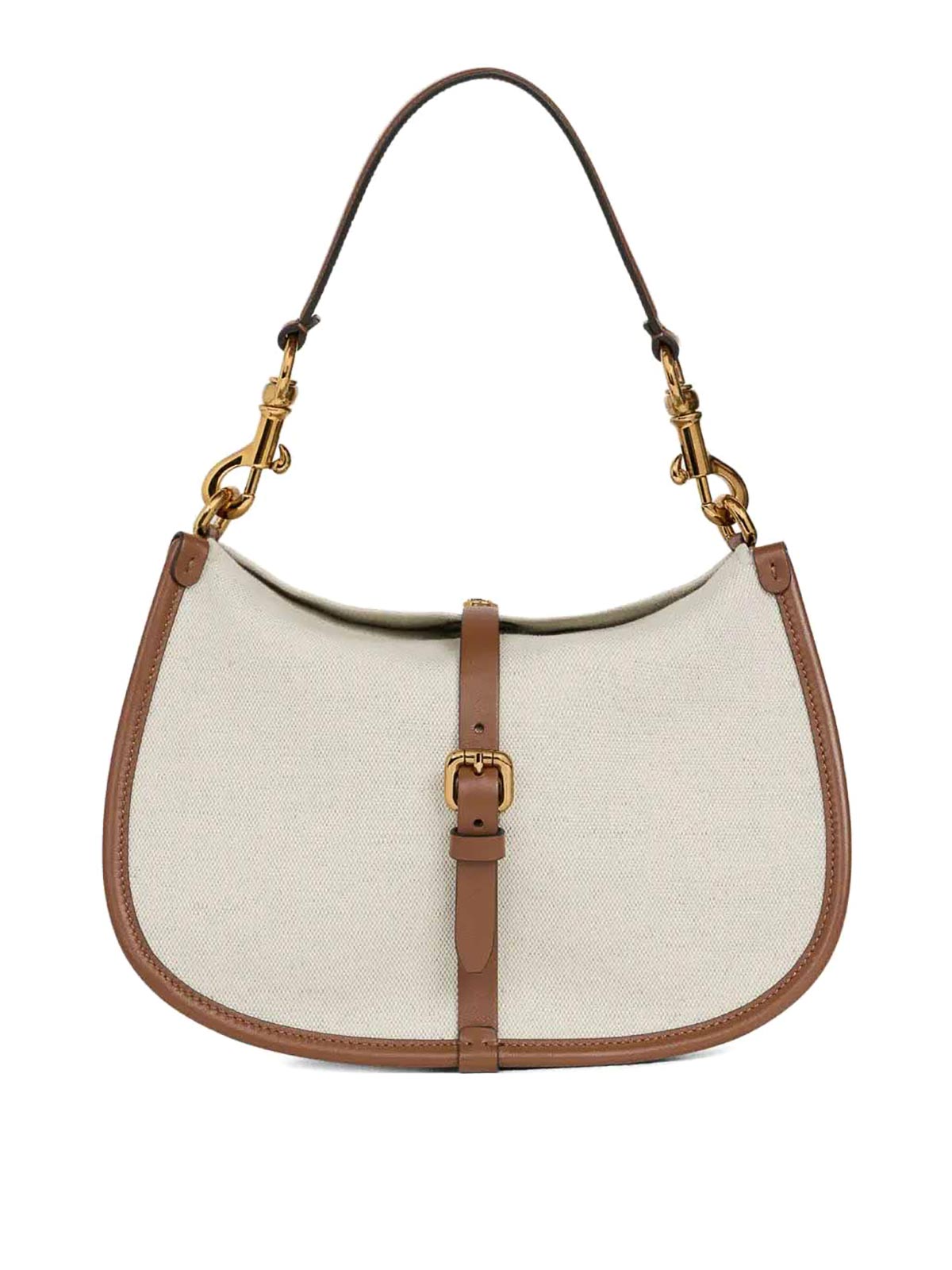 バックルクロージャー付きバッグ、調節可能なショルダーストラップ、ゴールドカラーのディテール。