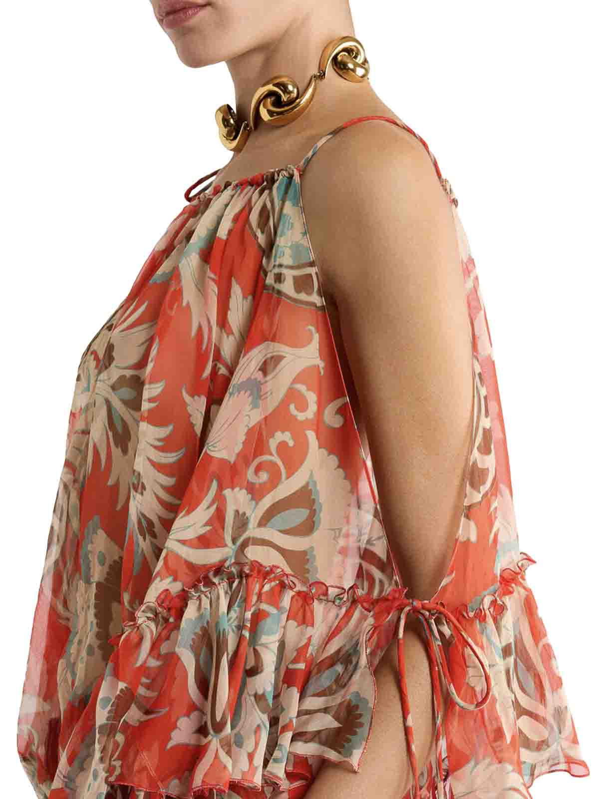 調節可能なドローストリングネックライン、細いショルダーストラップ、片側はノースリーブ、片側はノースリーブ、片側は調節可能なドローストリングスリーブ、ドローストリングヘム、ドローストリングヘム、シルクシフォン製、大きなコントラストの効いた花柄の装飾、レギュラーフィット、モデルの身長は176cm、サイズ40、100% シルク、色:マルチカラー