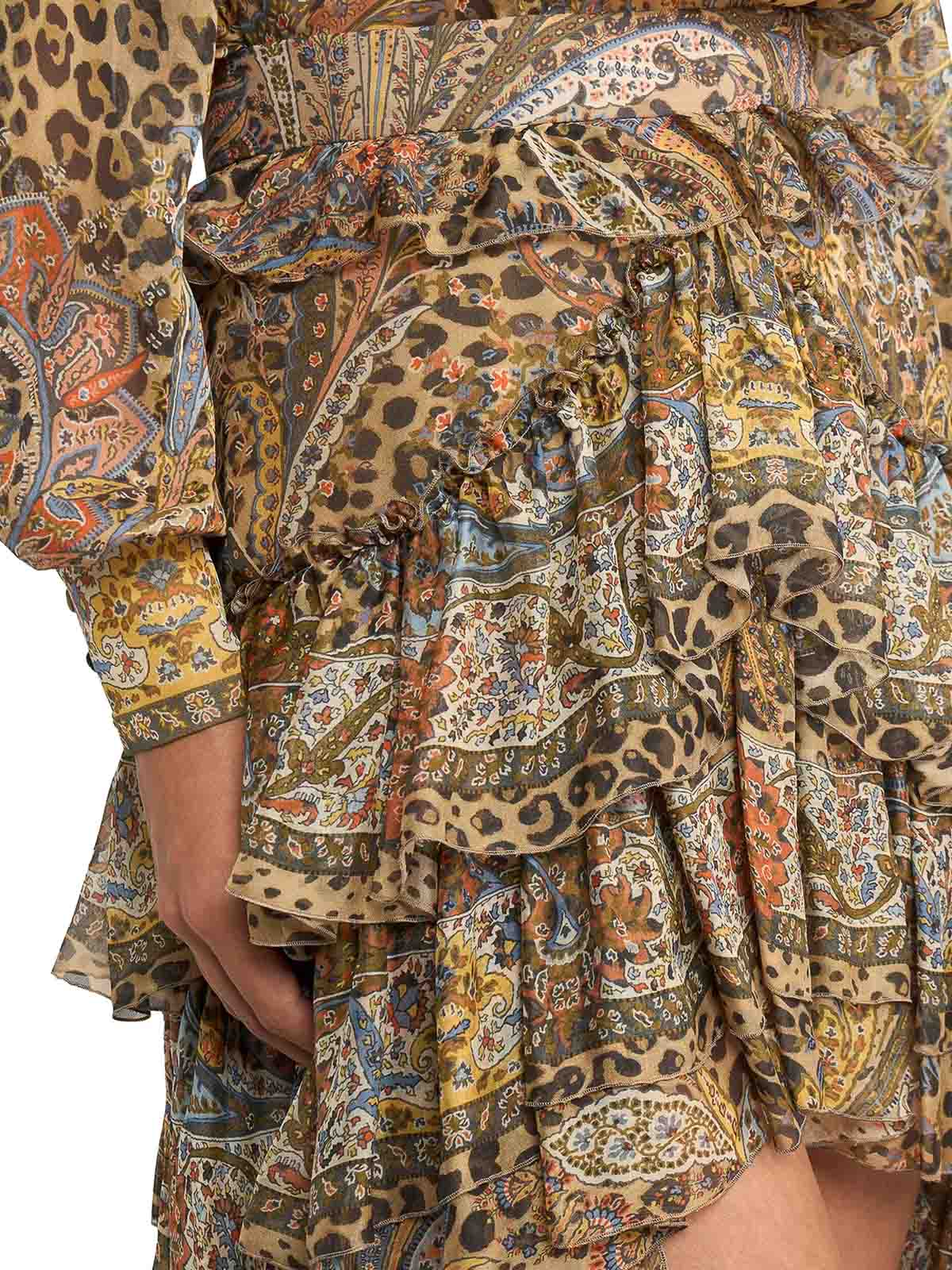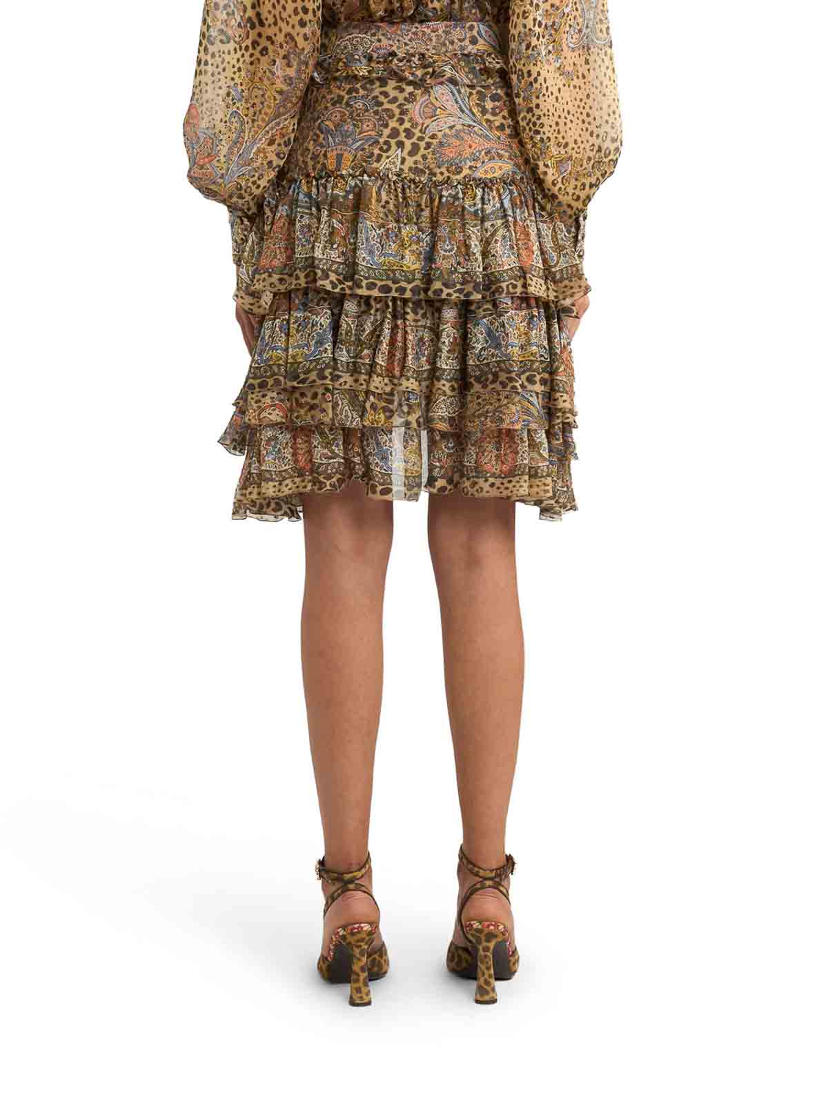 ミニスカート、ペイズリー柄とアニマル柄のディテールをあしらったパッチワークデザイン、お揃いのベルトとリボンが付いたハイウエスト、ギャザートリムのオーバーラップラッフル構造、後ろの長さが少し長めのアシンメトリーヘム、レイヤードボリュームがダイナミックで波状の効果を生む、フレアライン、レギュラーフィット、100% シルク、色:マルチカラー