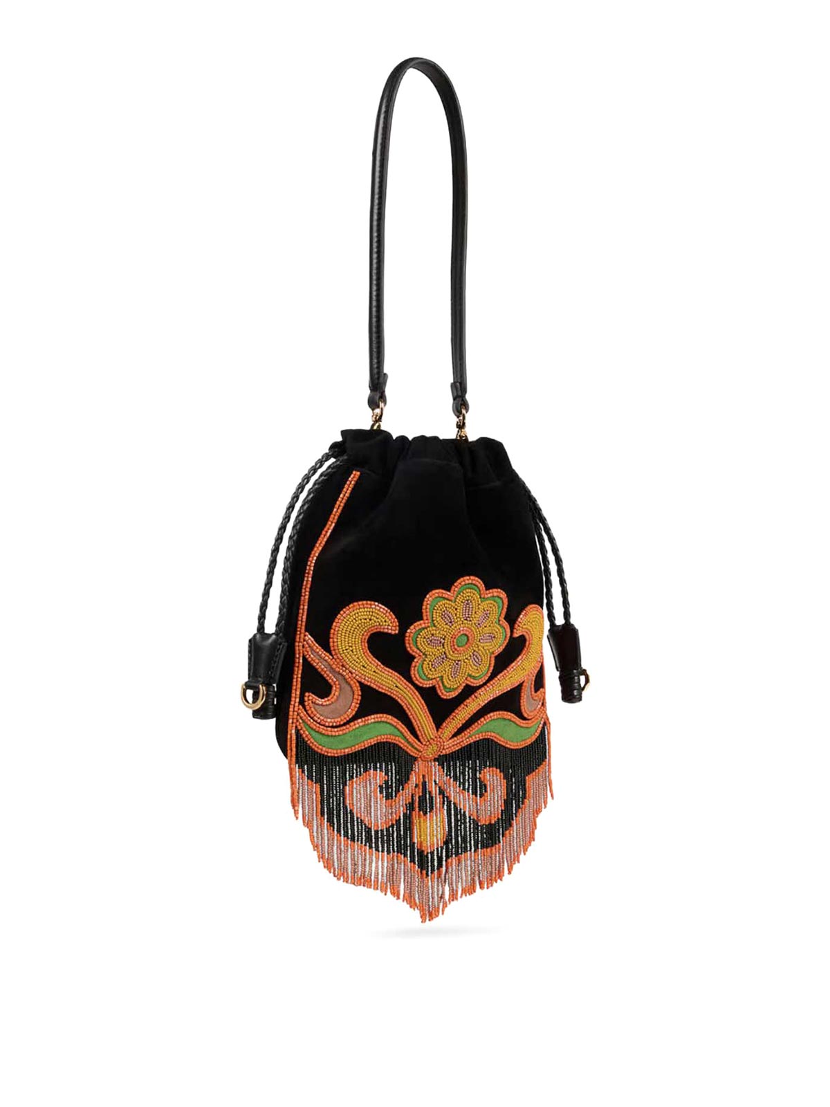kalispera スモールスエードトートバッグ、前面にカラフルなビーズとフリンジをあしらった花柄刺繍、寸法 22 x 22 cm、編み込みドローストリングクロージャー、取り外し可能なハンドル、内壁ポケット、ゴールド仕上げの金具、色:マルチカラー