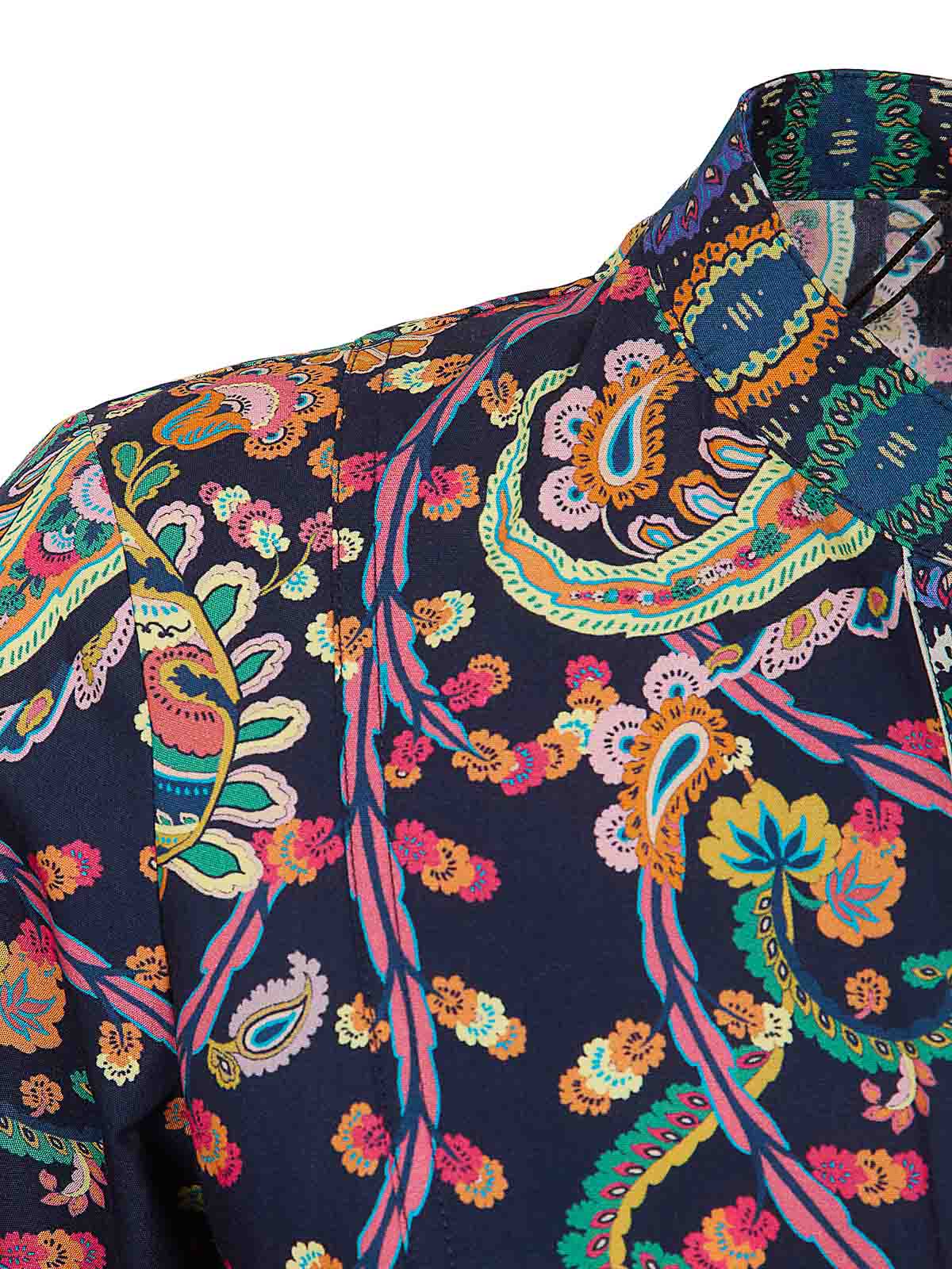 ピュアヘザーポプリンのドレス、マンダリンカラーのハーフスリーブ開口部、フィット感とフレアデザイン。マルチカラーのフローラルペイズリープリントを配し、ネック、ウエスト、袖、スカートに幾何学模様をあしらったのが特徴です。