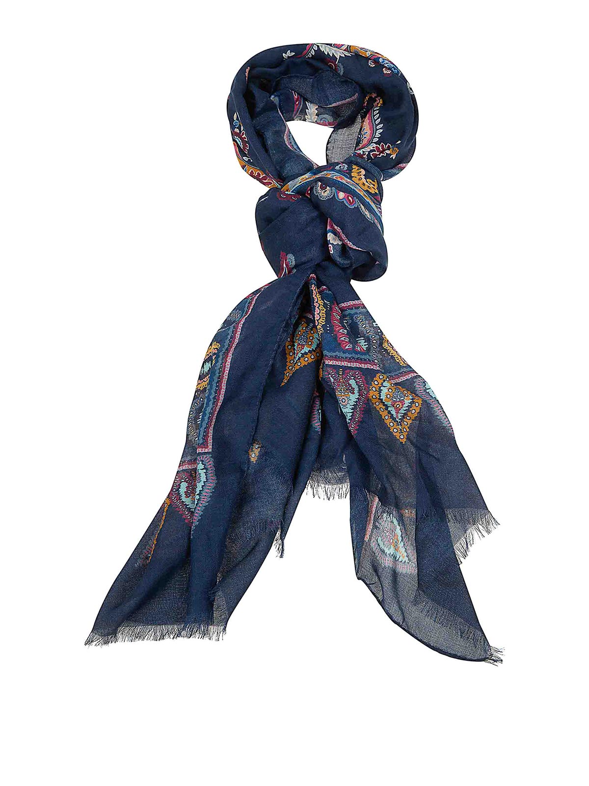モダールとエトロのスカーフ。サイドは短くほつれていて、花柄のインスピレーションとエトロのロゴをあしらったペイズリー柄が特徴です。