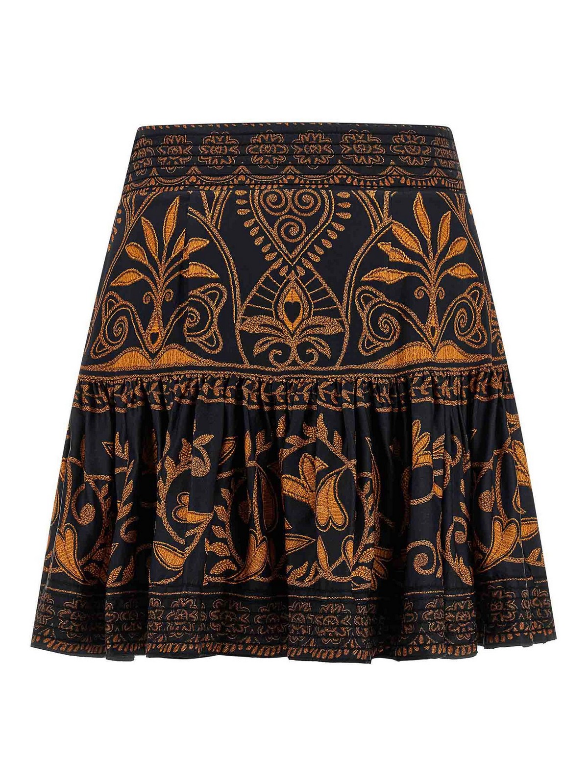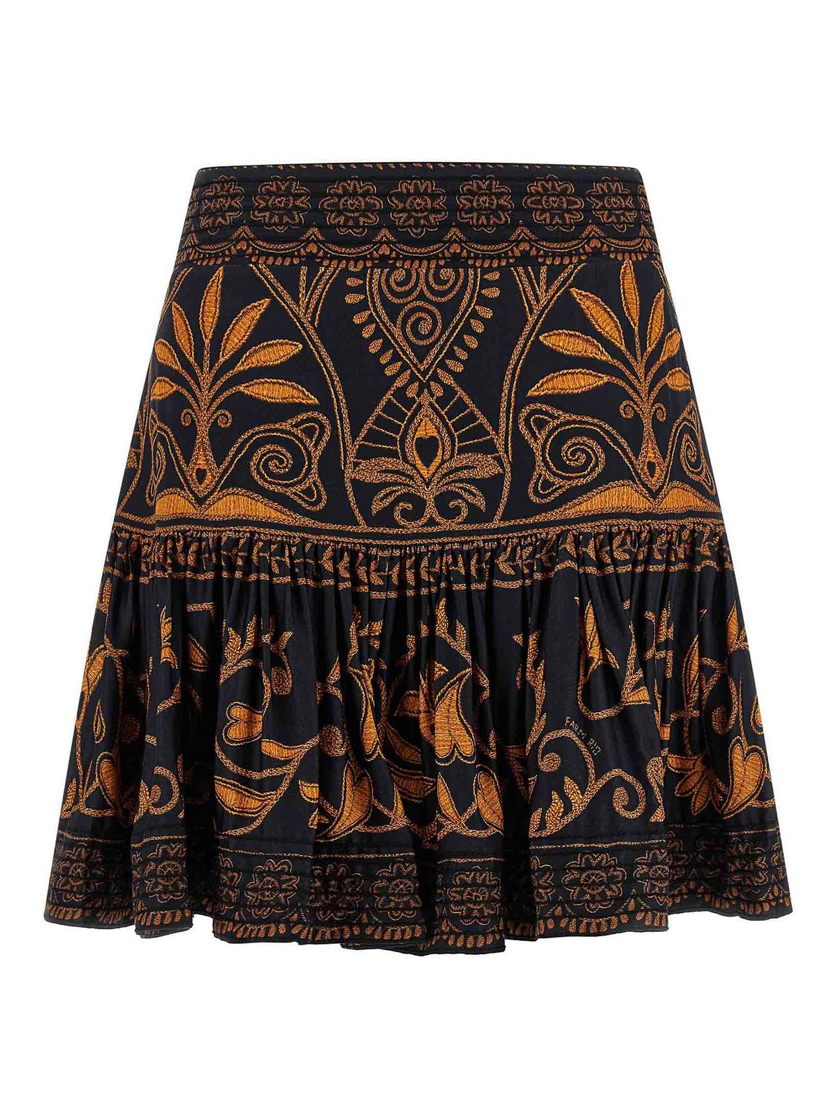 全体にフローラルプリントをあしらったシルクエフェクト生地のミニ「コーネリーアニカブラック」スカート、カールフリル付きフレアモデル、ウエストに刺繍のディテール、隠しジッパー付きのサイドクロージャー。