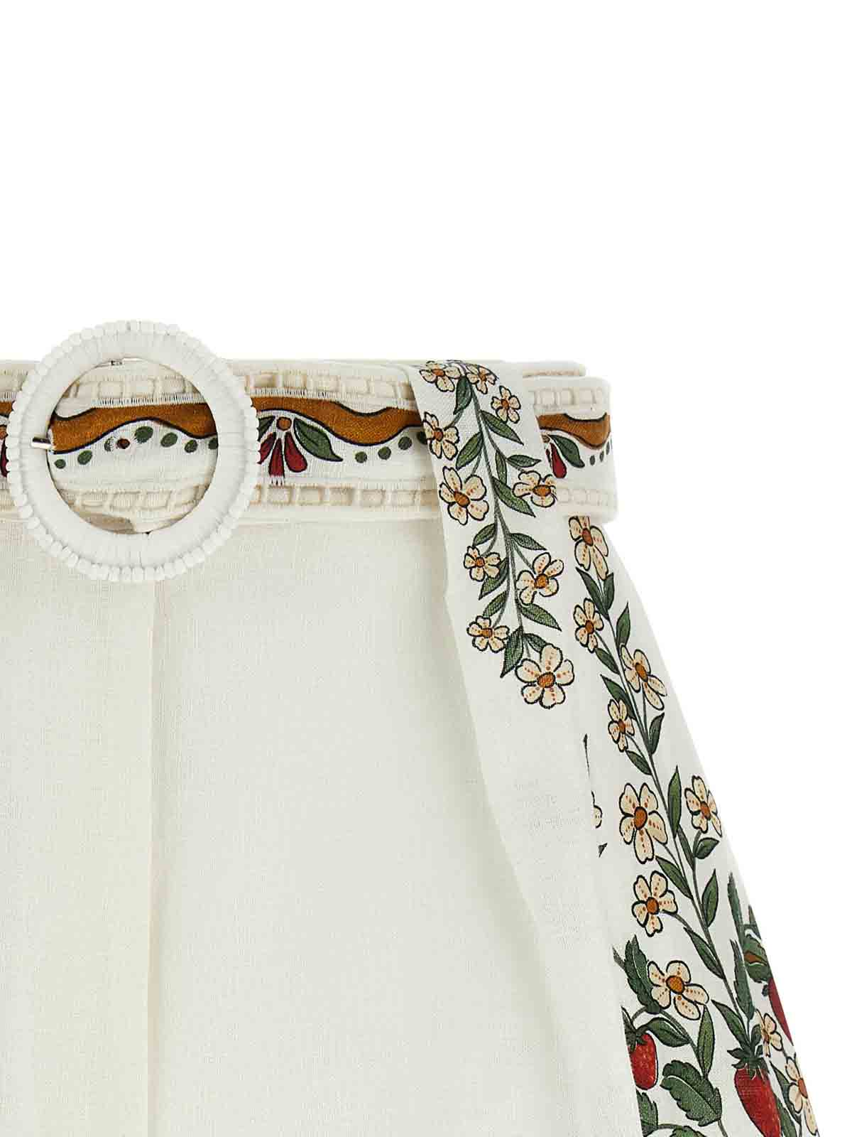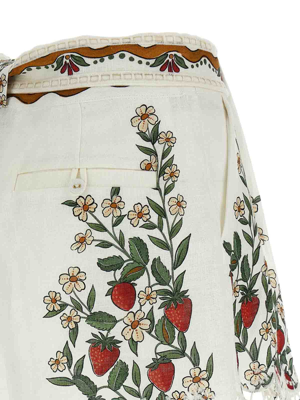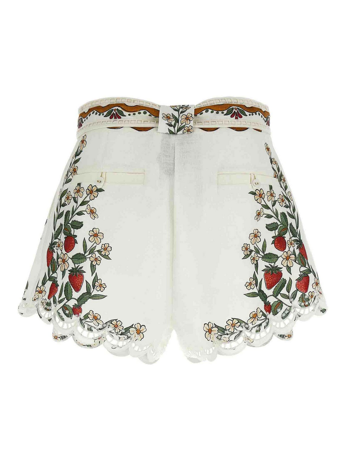 ユーロフラックスプレミアム「リシュリューオフホワイトフルーツビューティー」リネンショーツ、フロントガセットピンチ、フック&ボタンファスナー、ウェルトポケット、アシンメトリーヘムにカットアウト刺繍、取り外し可能なマッチングベルト。