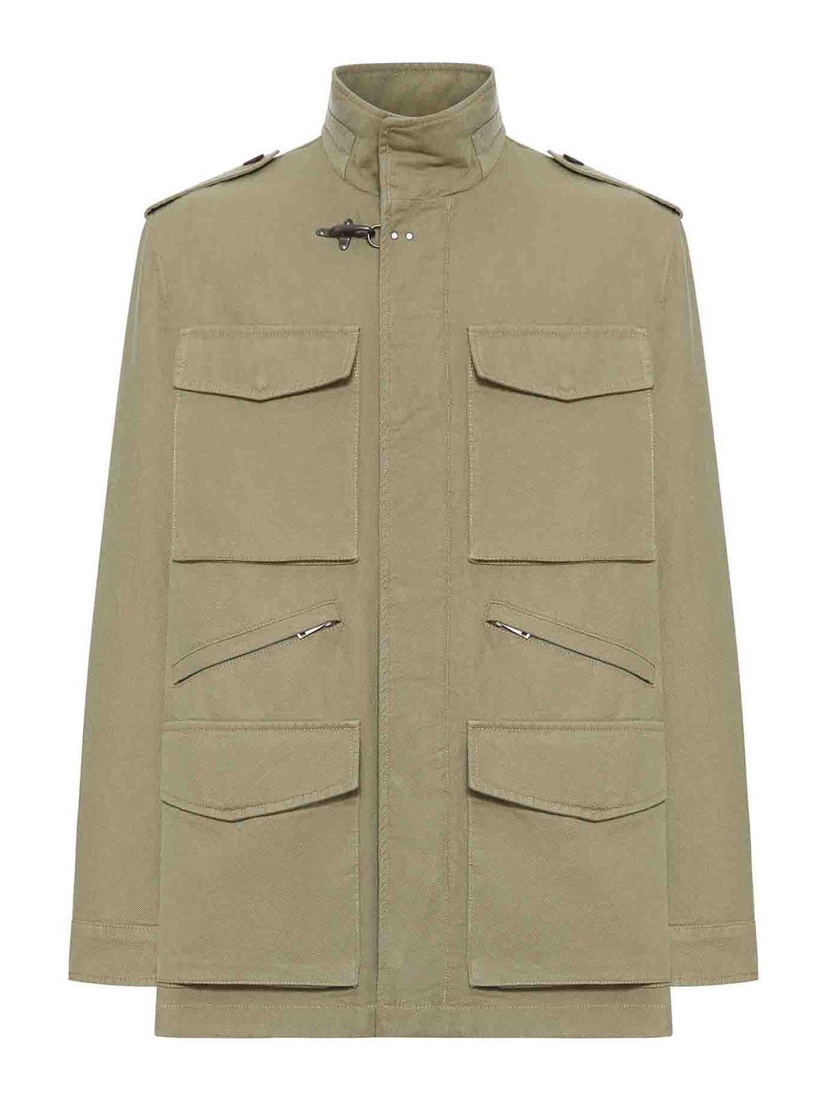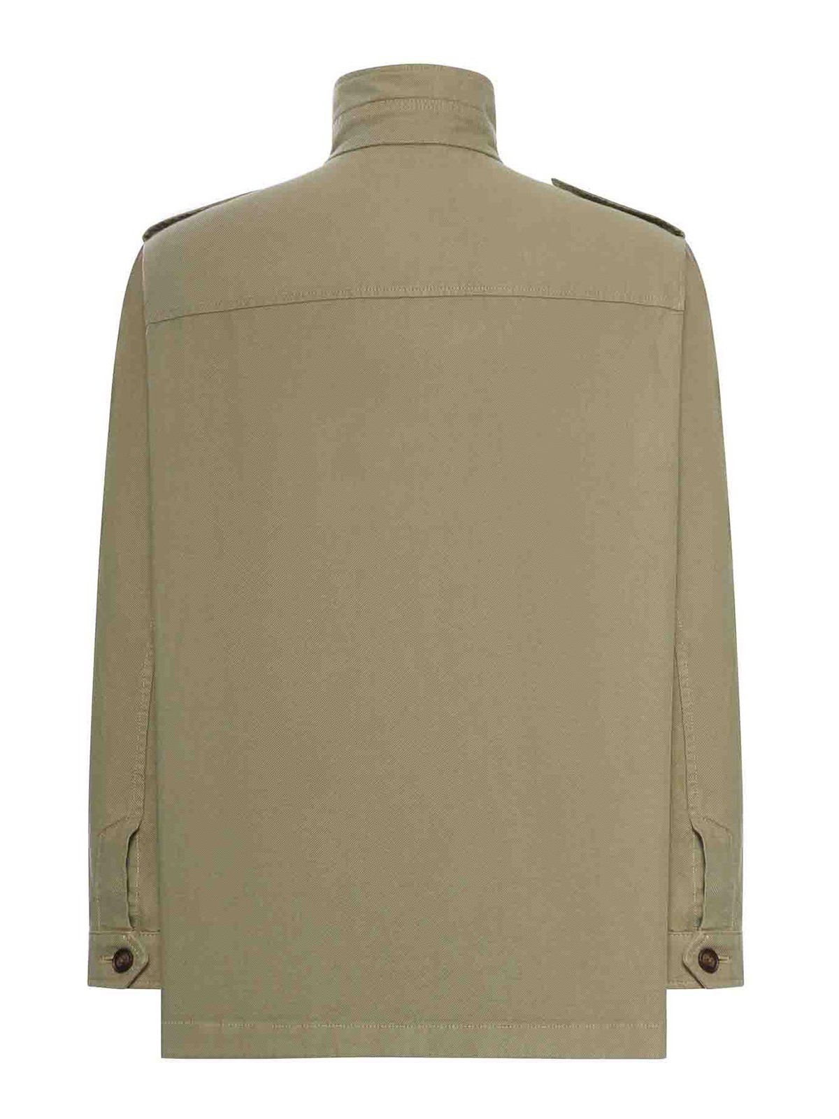 しっかりとしたハイカラー、隠しフロントファスナー、襟にアイコニックなメタルフック、フラップ付きパッチポケット、ミディアムジップポケット2つ、レギュラーフィット、ロングスリーブ、カラー:アブサン