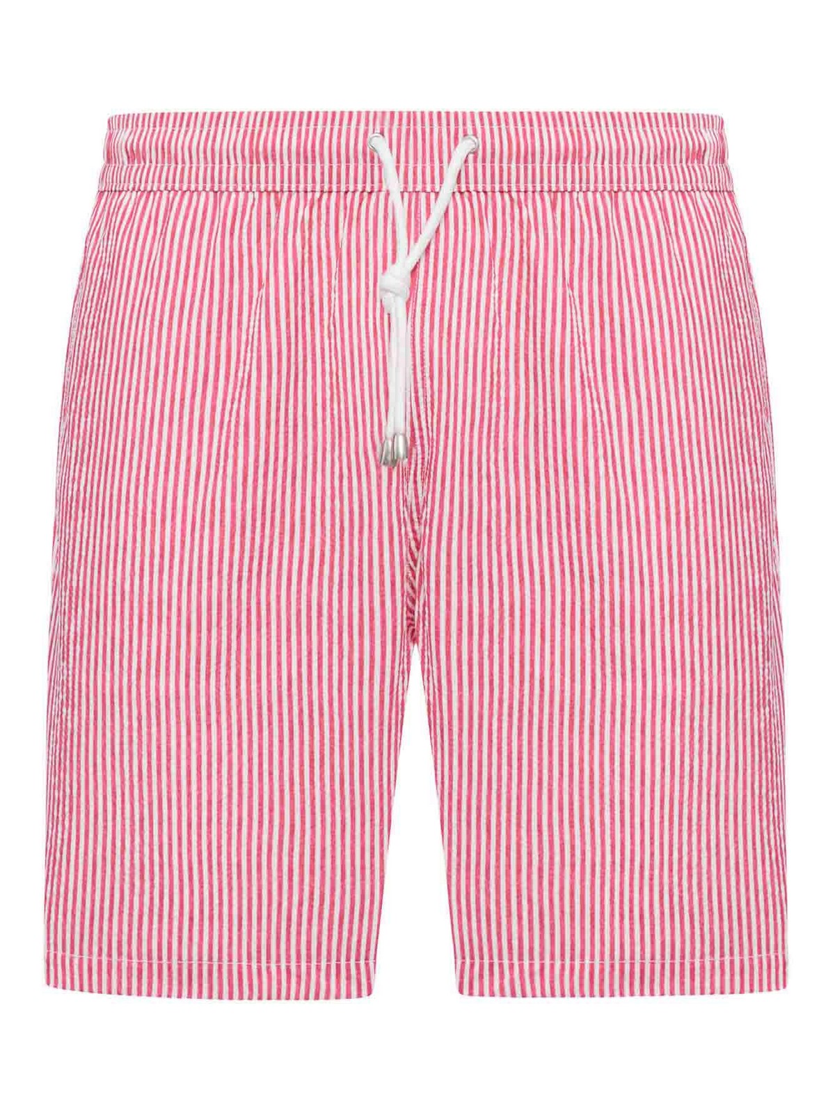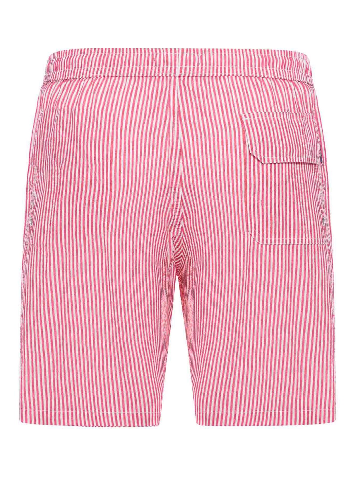 赤と白の縦縞模様、伸縮性ウエスト、調節可能なドローストリング、コントラストカラーのドローストリング、フラップ付きバックパッチポケット、膝上までの長さ、精巧な仕上がりと丈夫なステッチ、レギュラーフィット、色:赤/白