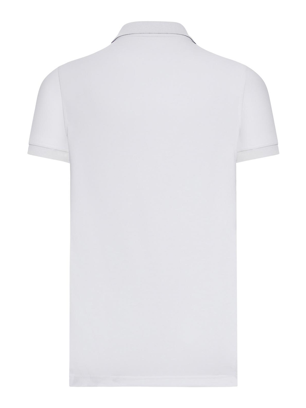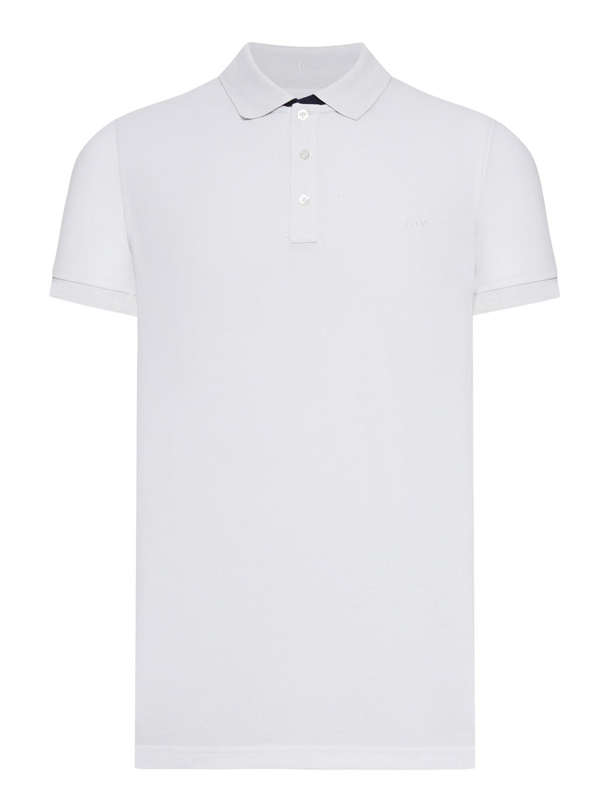 クラシックカラー、襟にコントラストインサート、部分的にフロントボタン留め、半袖、トーン・オン・トーンのロゴ刺繍、ストレートヘム、レギュラーフィット、カラー:ホワイト