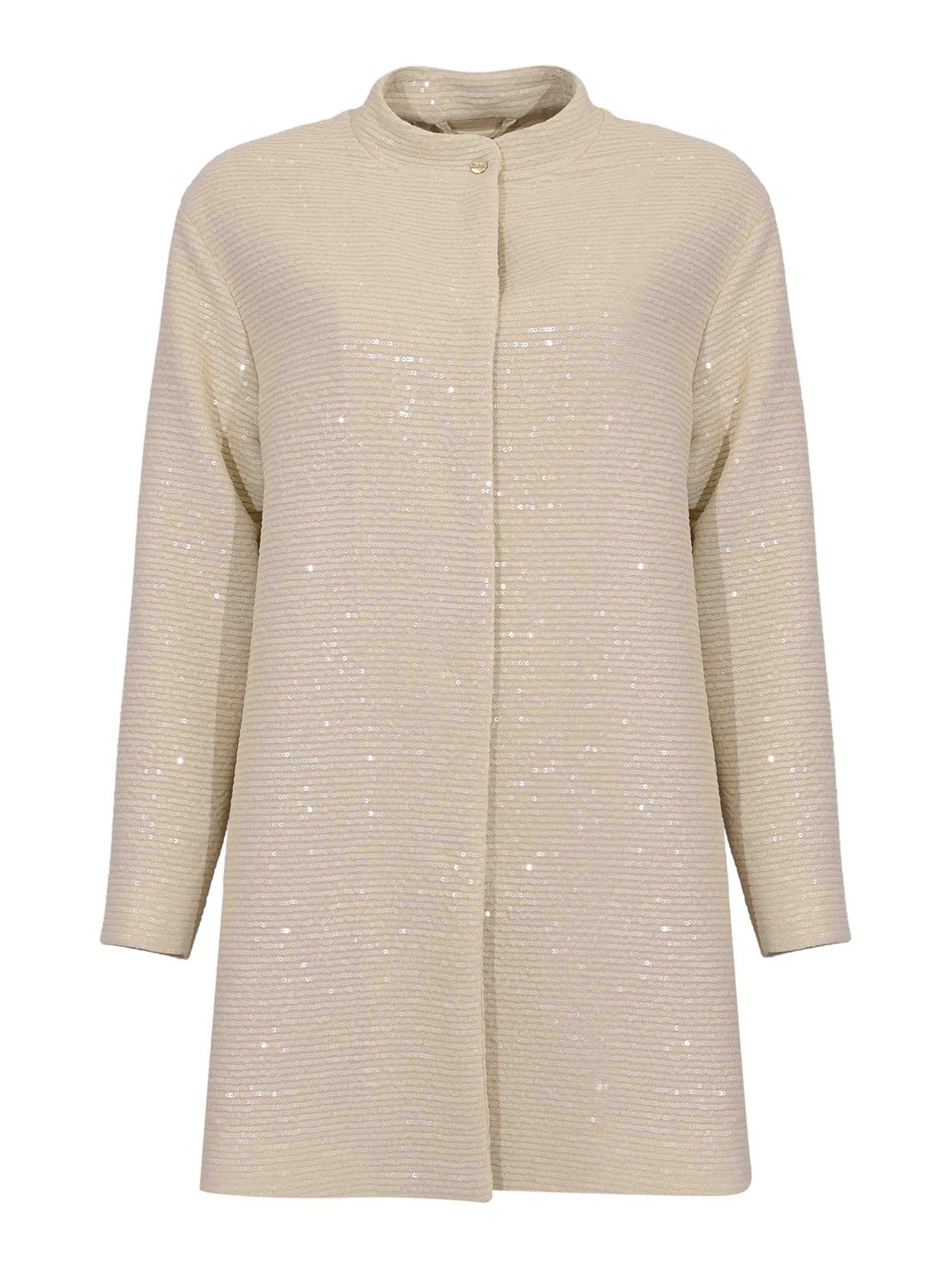 スパンコール付き女性用コート、Herno、生地:スパンコール付き生地、パターン:無地、袖:ロング、襟:タートルネック、クロージャー:スナップボタン付き、ポケット:なし、ディテール:全面にスパンコール加工、裏地:S、フィット:レギュラー