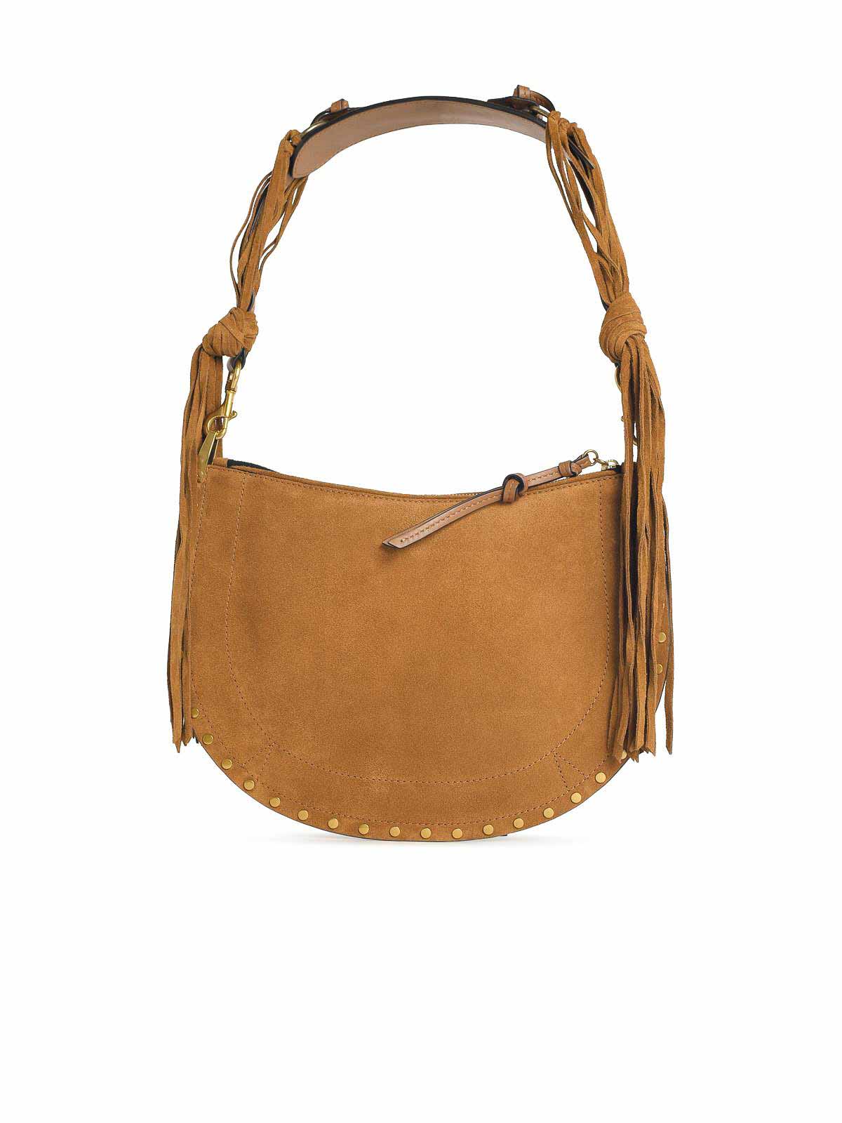 スエードカーフスキンのクレセントバッグ、スタッズ付きエッジ、フリンジ付きの取り外し可能なショルダーストラップ、メタルジッパー、ゴールドの「isabel marant」の文字がエンボス加工されたスムースレザーのインナーカードポケット、ファブリックライニング、ゴールドメタル仕上げ 34 x 23 x 3 cm