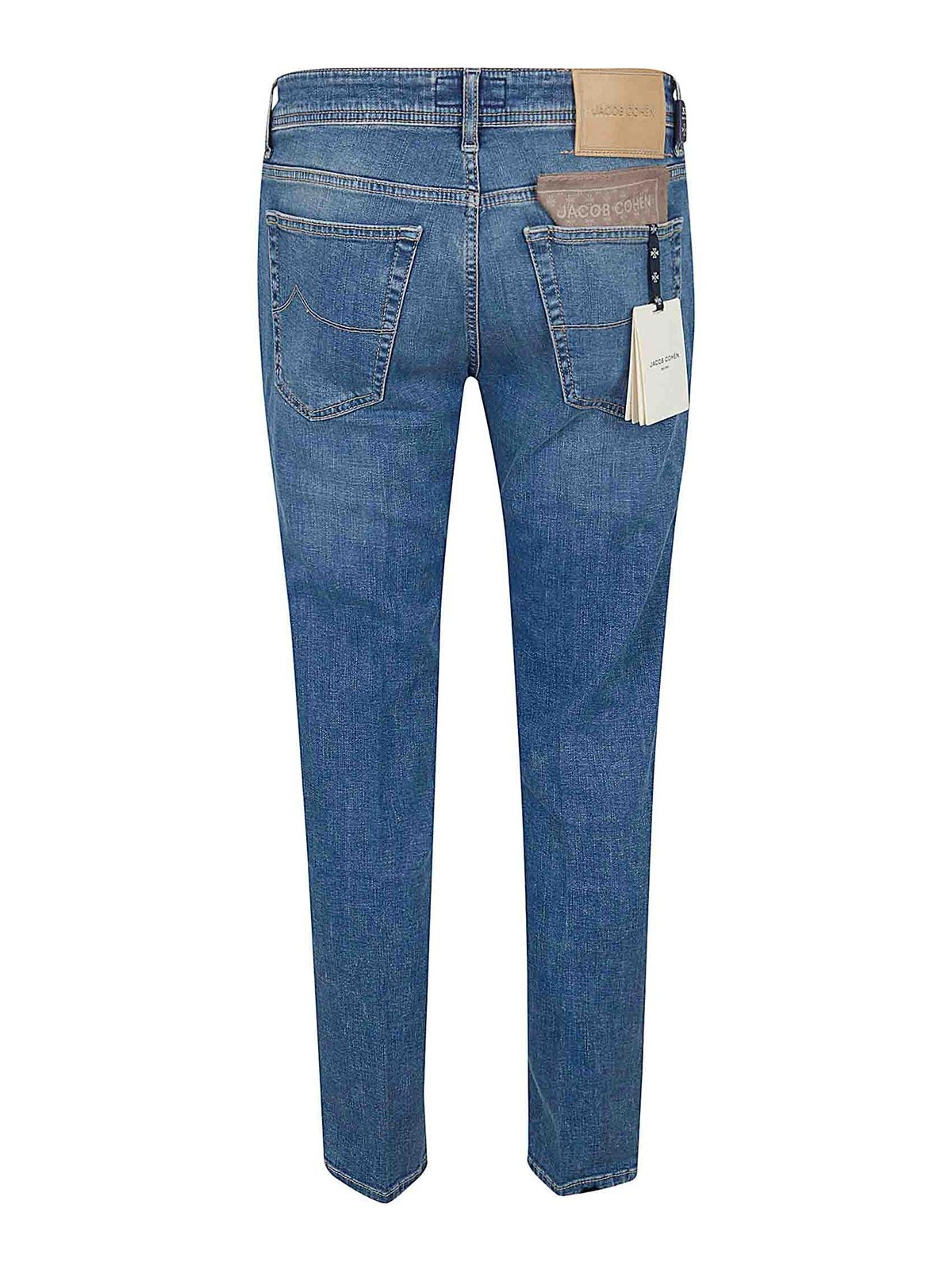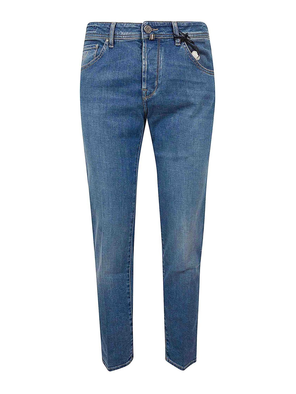 Jacob Cohenのデニム製スコットジーンズ、5ポケットボタン付き、スリムフィットデザイン。バンダナのロゴをあしらったタッセルが特徴で、Jacob Cohen限定のフレグランスの香りが特徴です。
