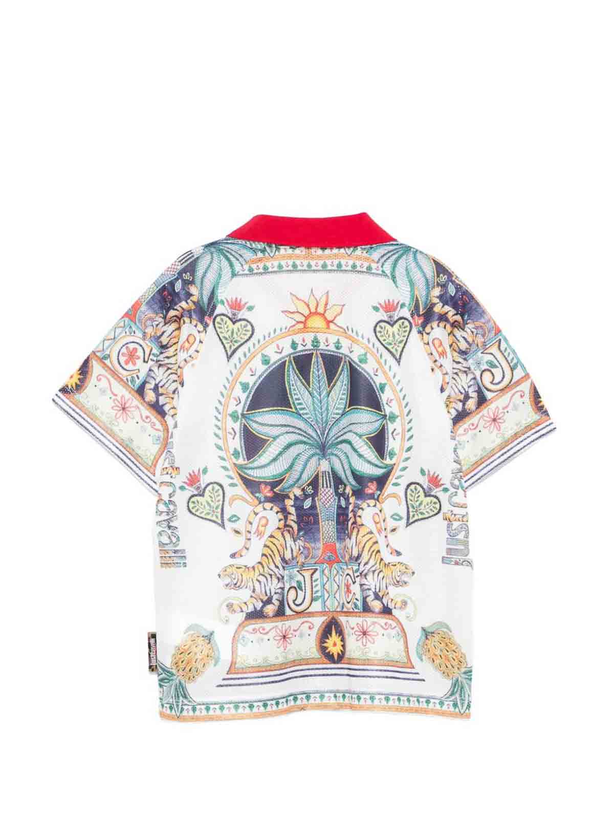 グラフィックプリントの半袖が特徴のマットホワイトのポロシャツ