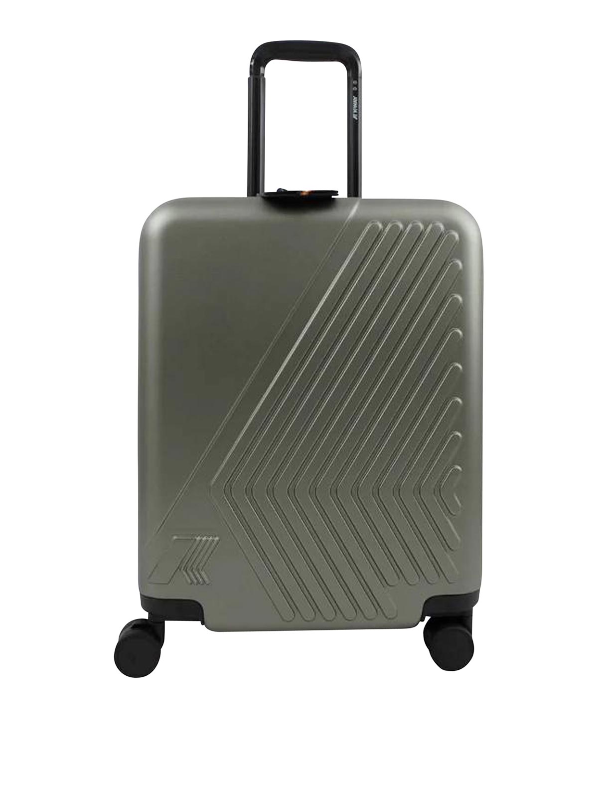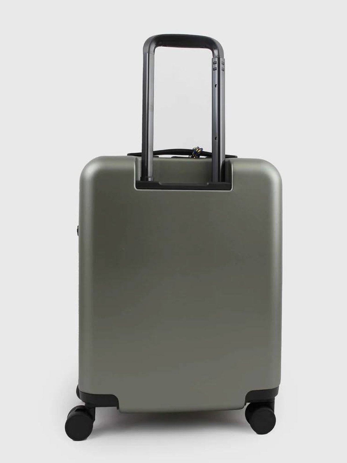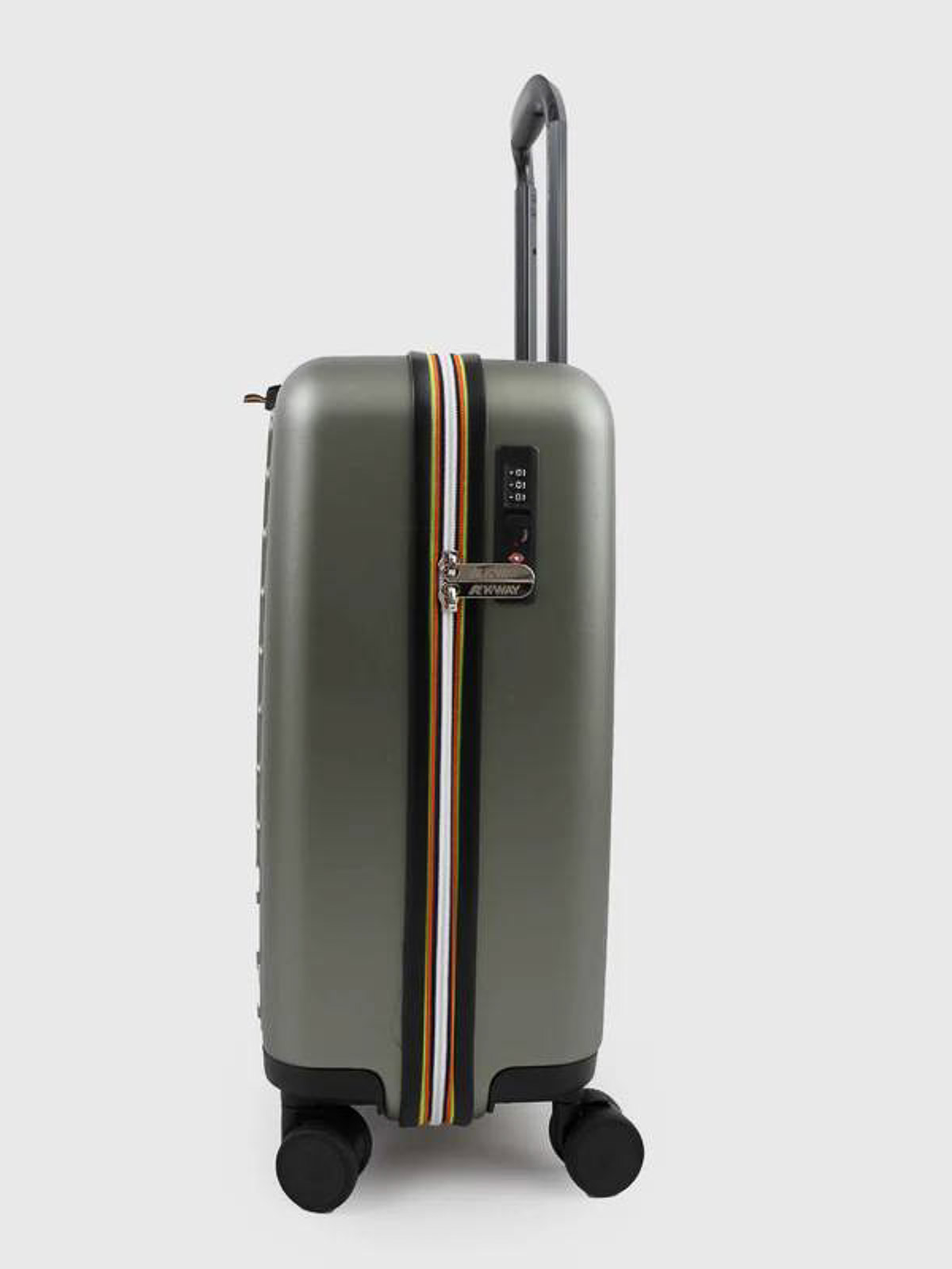 全面にロゴがプリントされたグリーンのリジッドモデルのトロリースーツケースには、取り外し可能なメッシュの仕切りパネル、小さなジッパーポケット、便利なドローストリング付きのランドリーバッグが付いています