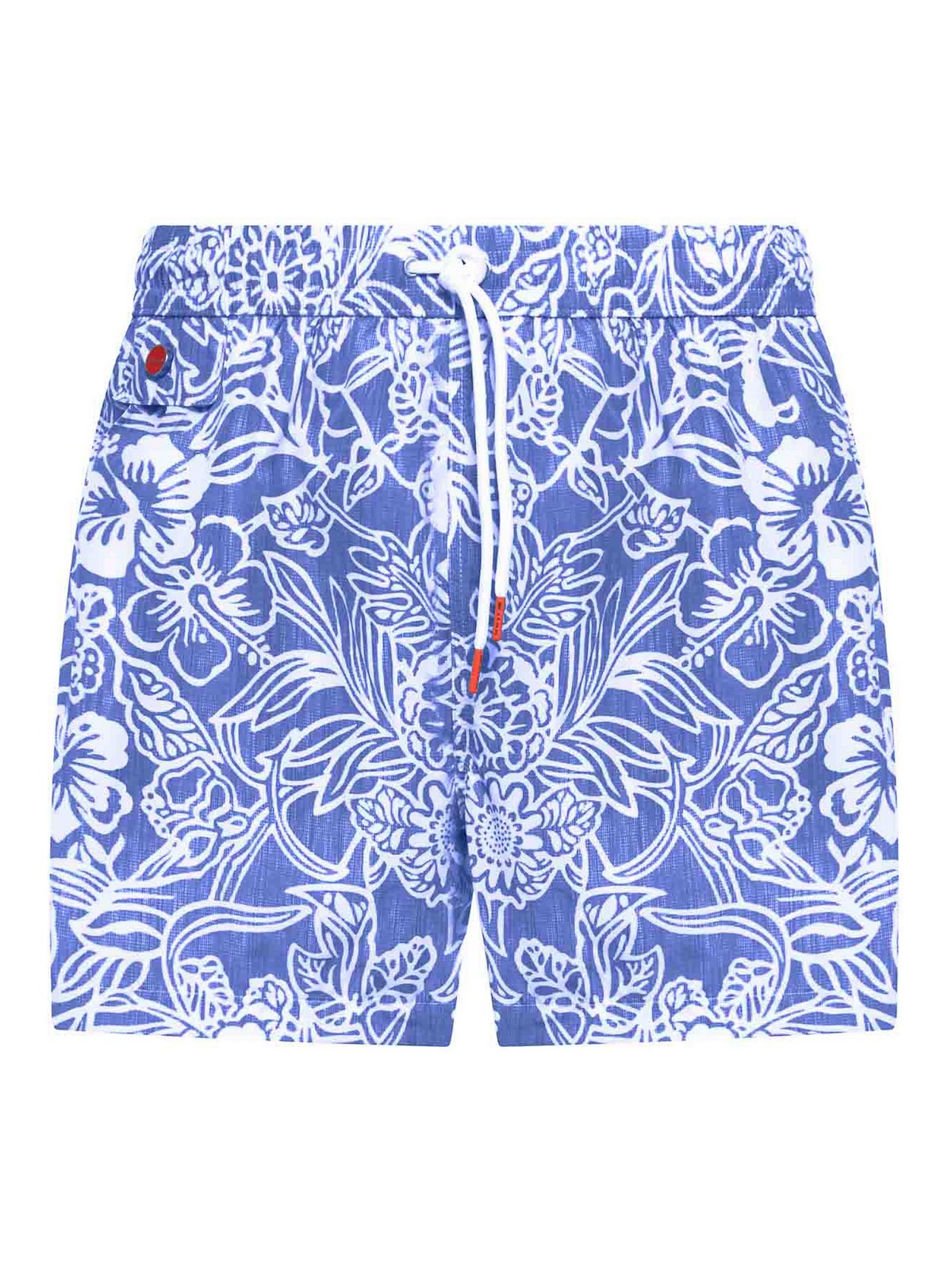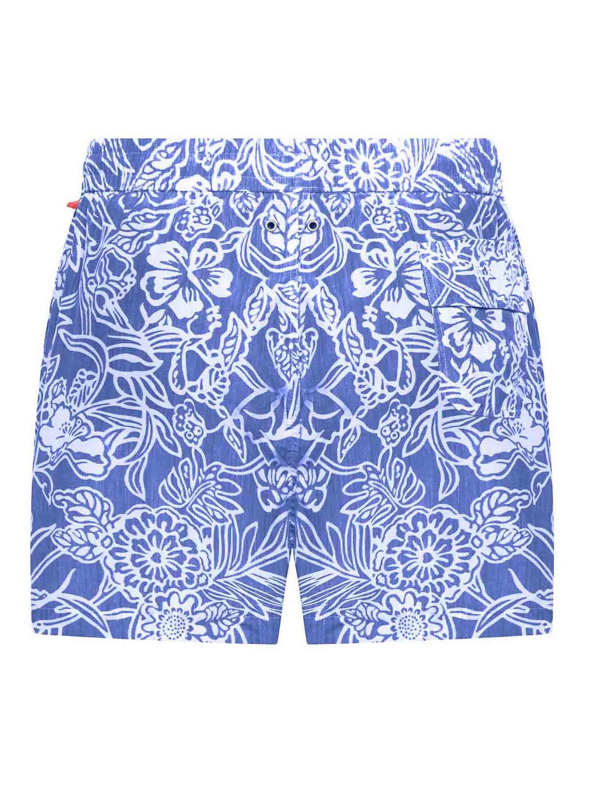 ブルーの背景に白いモチーフをあしらった全面花柄、コントラストカラーの調節可能なドローストリング付きの伸縮性ウエスト、はめ込み式サイドポケット、フラップとロゴのディテールが付いたバックパッチポケット、背面にメタルアイレット、ミドルレングス、膝上、レギュラーフィット、カラー:ブルー/ホワイト