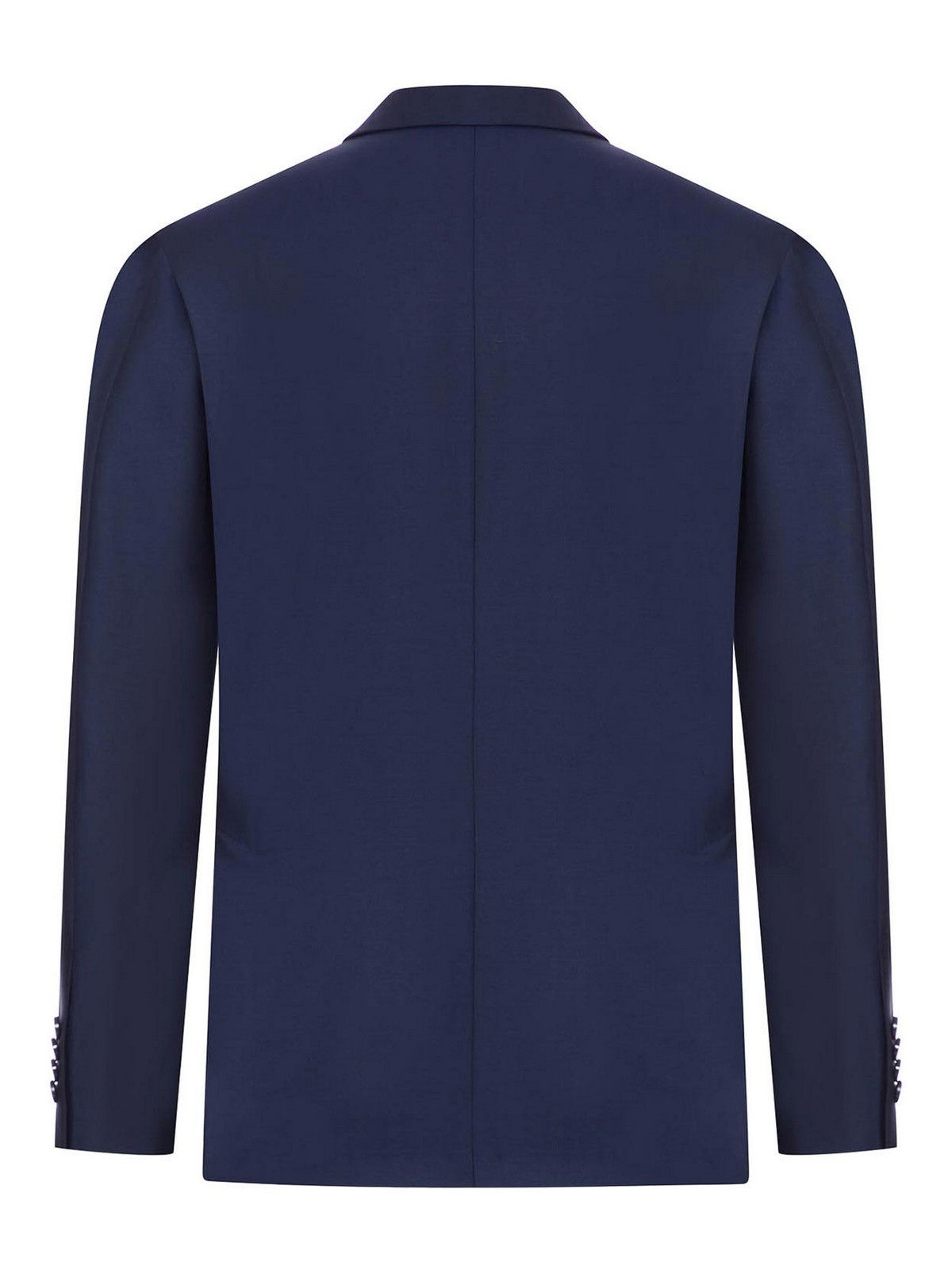 ジャケット、2ボタンフロントクロージャー、ノッチラペル、ロングスリーブ、ボタン付きカフス、ポケットスクエア、フロントウェルトポケット2つ、ダブルバックベント、裏地付きパンツ、フロントボタンとジッパー、ベルトループ、サイドウェルトポケット2つ、ボタン付きバックウェルトポケット2つ、テーパードレッグ、色:ブルー、100%バージンウール