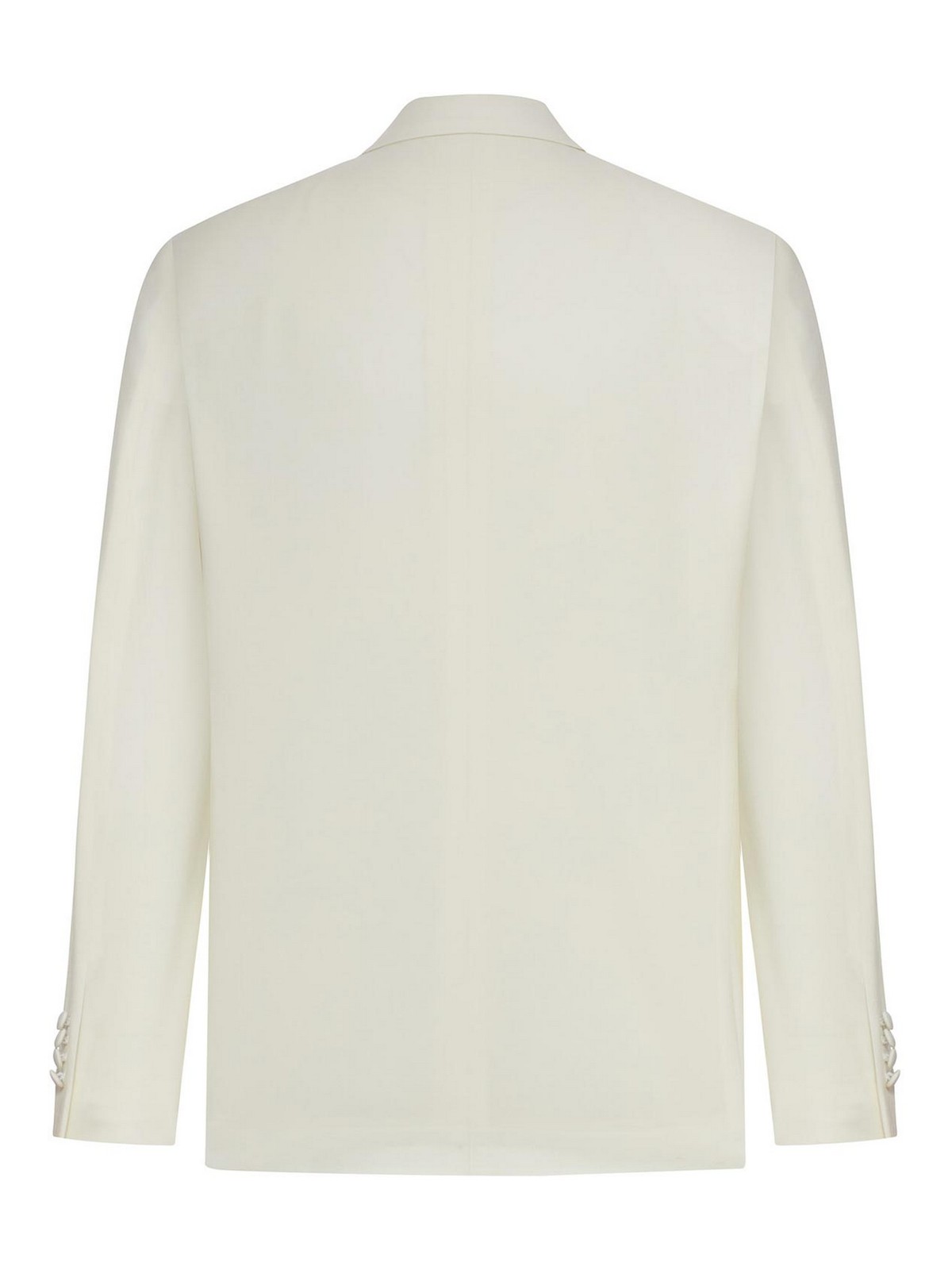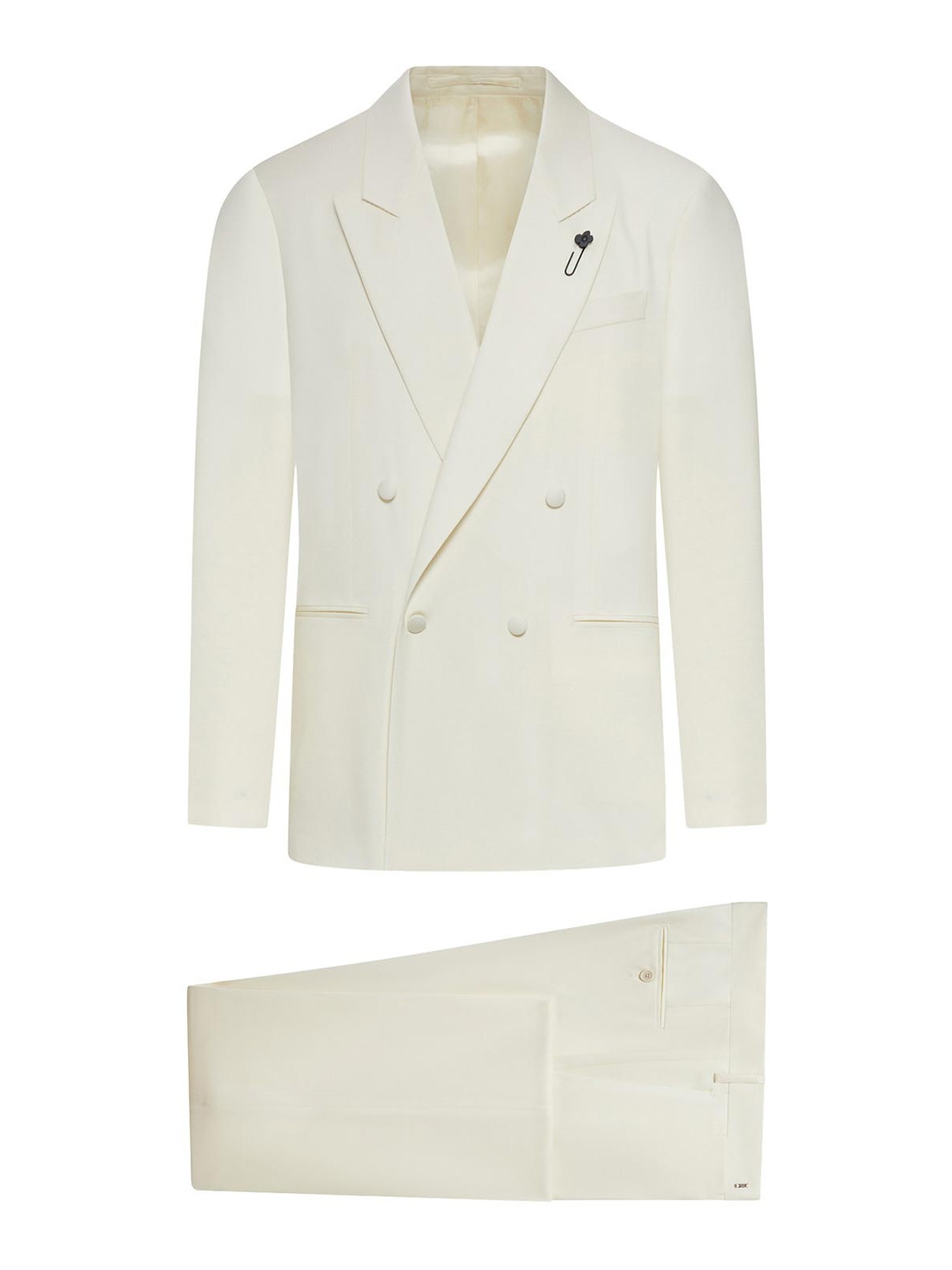 ジャケット、ダブルブレストブレザー、トーン・オン・トーンで覆われた6つのボタン付きフロントクロージャー、幅広でしっかりとしたピークラペル、ラペルに装飾ピン、胸元ウェルトポケット、フロントフラップウェルトポケット2つ、ボタン付きカフス付きロングスリーブ、マッチングライニング、レギュラーフィットパンツ、レギュラーウエスト、ベルトループ、フロントジッパーとボタンクロージャー、フロントダーツ、インセットサイドポケット2つ、ストレートレッグ、バックボタン付きウェルトポケット2つ、100% バージンウール、レギュラーフィット