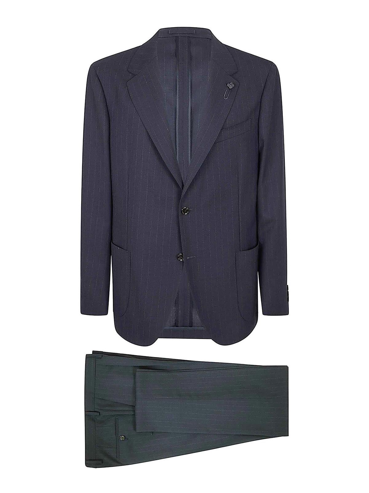 ウールとライトラルディーニのピンストライプのローマラインスーツ、クラシックなラペルジャケット、パッチポケット、フロントボタンが2つ付いたウェルトポケット1つ、袖口にはテーラードデザインのズボン、斜めポケット2つ、バックベルトループにブランドロゴのブローチが特徴のウェルトポケット2つ