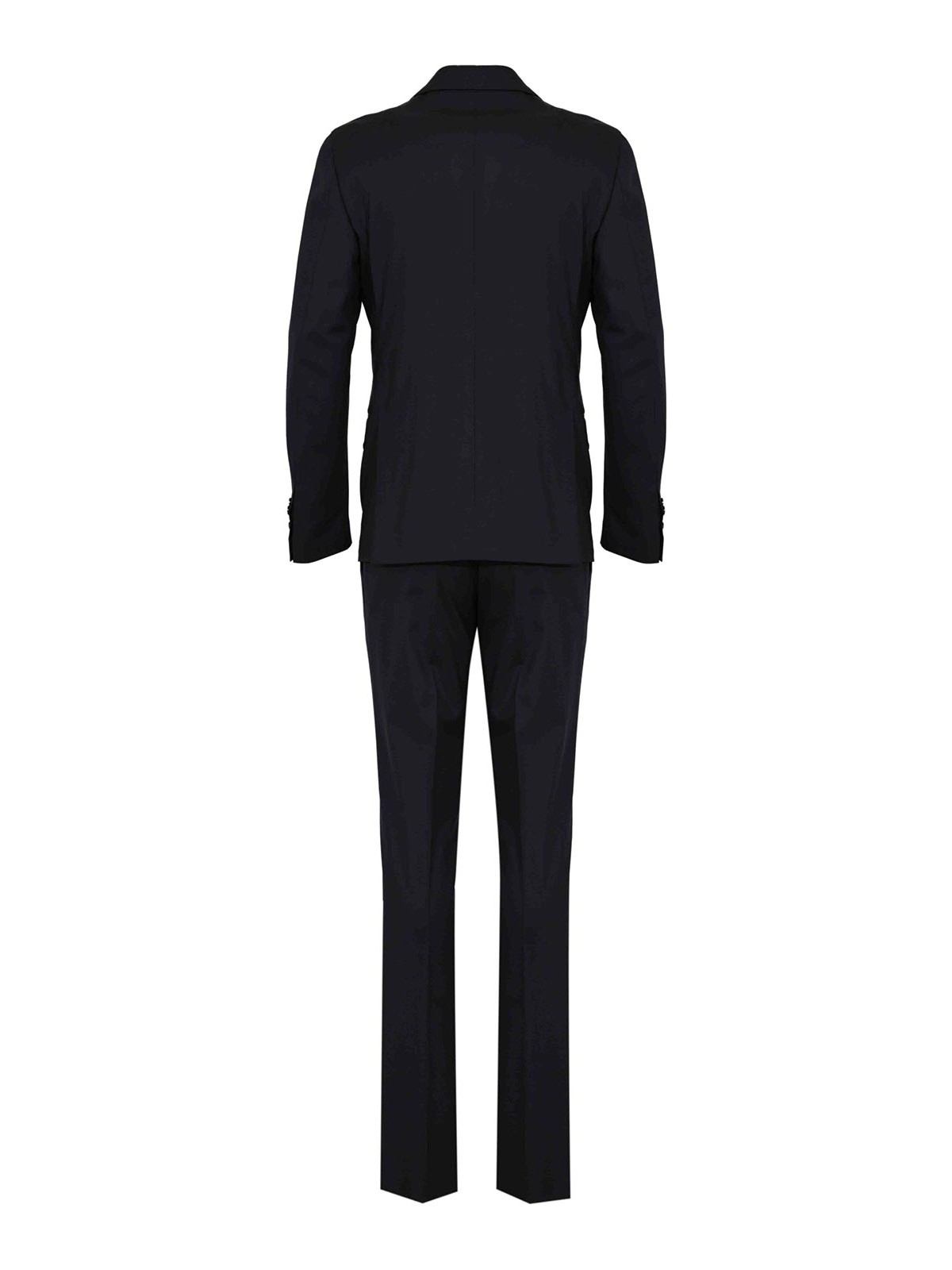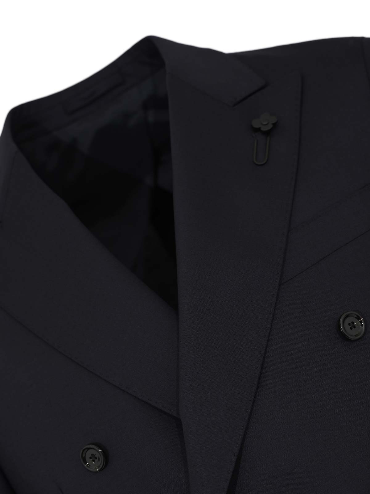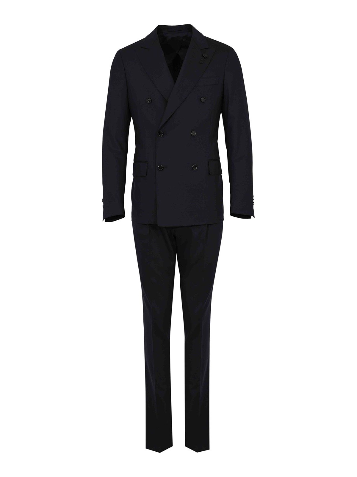 バージンウールのメンズスーツ、ラルディーニ、アイコニックドロップ7レッグモデル、生地:バージンウール、パターン:ソリッドカラー、袖:袖口にボタンが付いたロング、襟:クラシックラペル、クロージャー:ボタン付きダブルブレスト、ポケット:胸にウェルトポケット1つ、フロントフラップポケット2つ、ディテール:ラペルにアイコニックなラルディーニブローチ、フロントプリーツとジッパーとボタンが付いたパンツクロージャー、裏地:S、フィット:レギュラードロップ 7