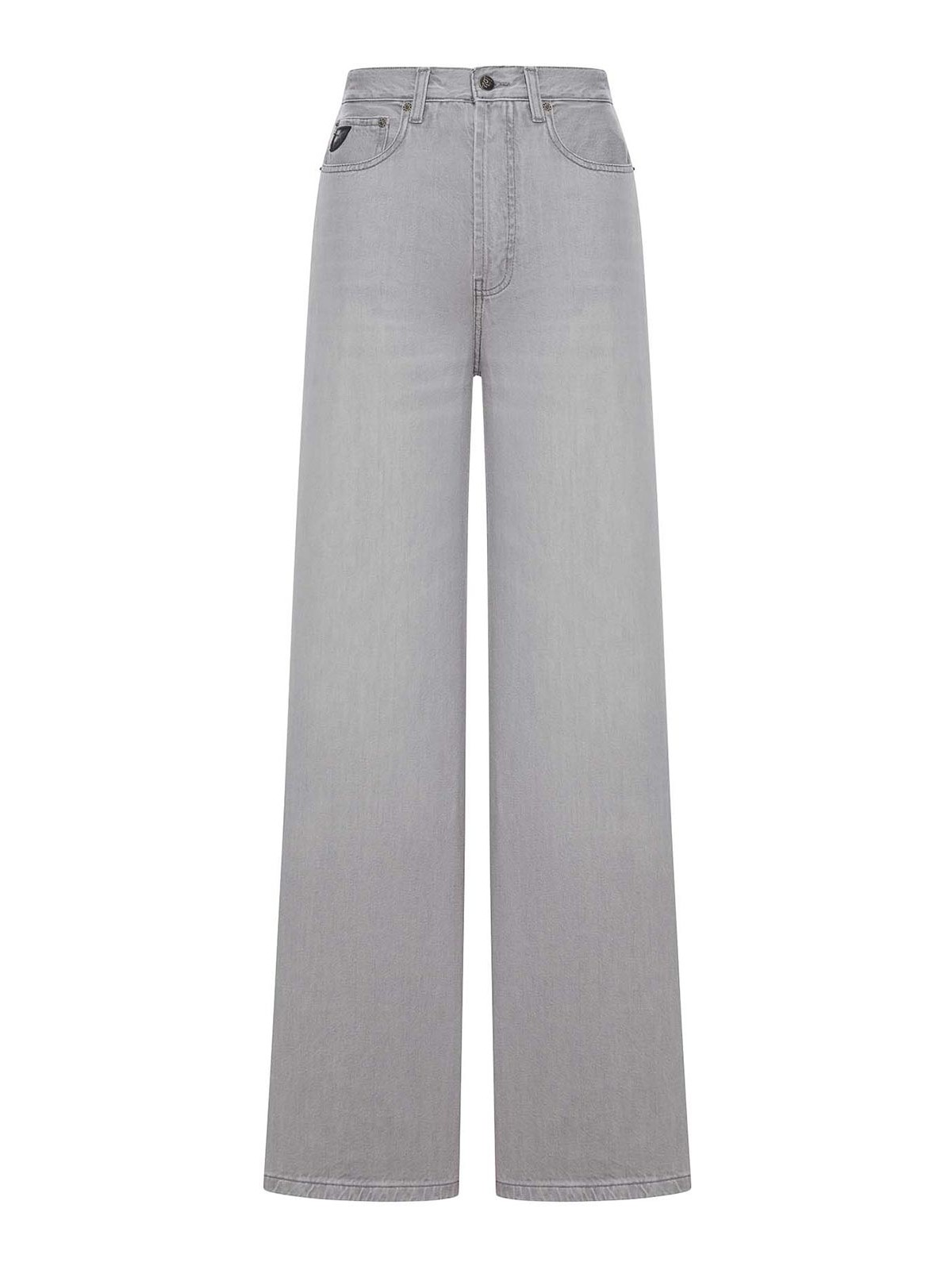 ハイウエスト、ベルトループ、ボタン留め、5ポケットデザイン、ワイドレッグ、背面にロゴパッチ、ルーズフィット、綿 100%、色:グレー