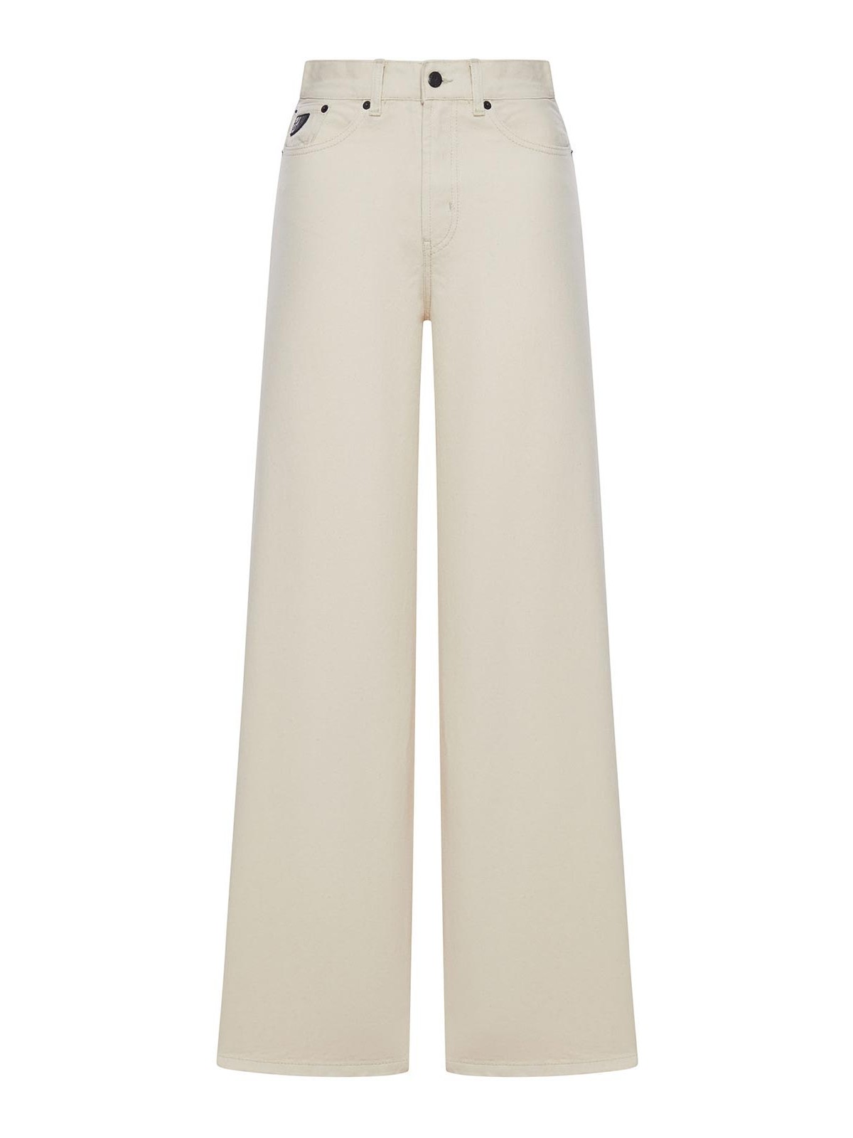 フィット感のあるハイウエスト、ベルトループ、フロントジッパーとボタンクロージャー、5ポケットデザイン、ワイドレッグ、ワイドヘム、バックにレザーロゴパッチ、硬くて伸縮性のない生地、100% コットン、モデルの身長は177cm、サイズ27を着用、色:エクリュ