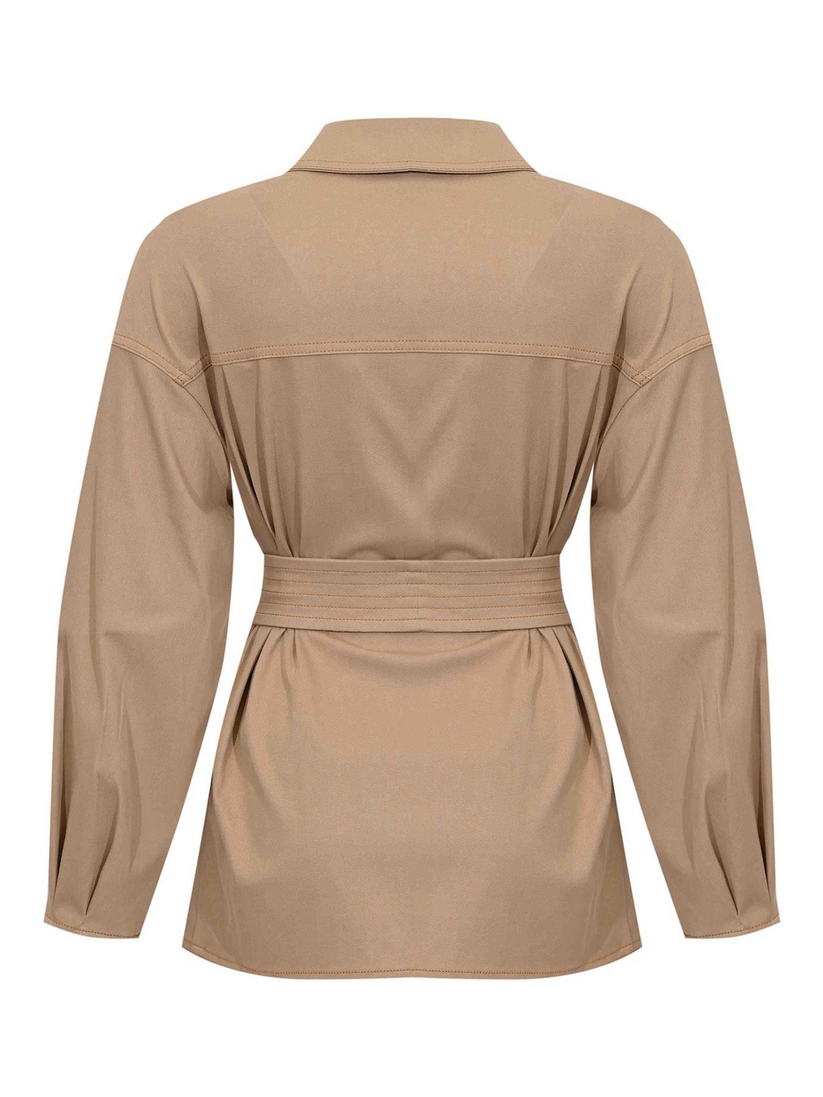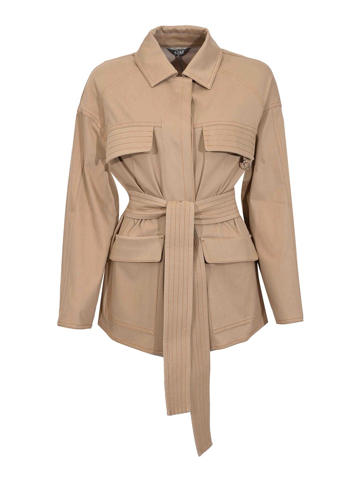 コットン混紡女性用ジャケット、mm max mara、mmlwestモデル、生地:コットン混キャンバス、生地:無地、袖:ロング、襟:クラシックポインテッド、クロージャー:ウエストにベルトで前面カバー、ポケット:フロントにフラップ付き、ディテール:コントラストステッチ、コーディネートベルト、サイドメタルリング、サハラライン、裏地:いいえ、フィット:レギュラー