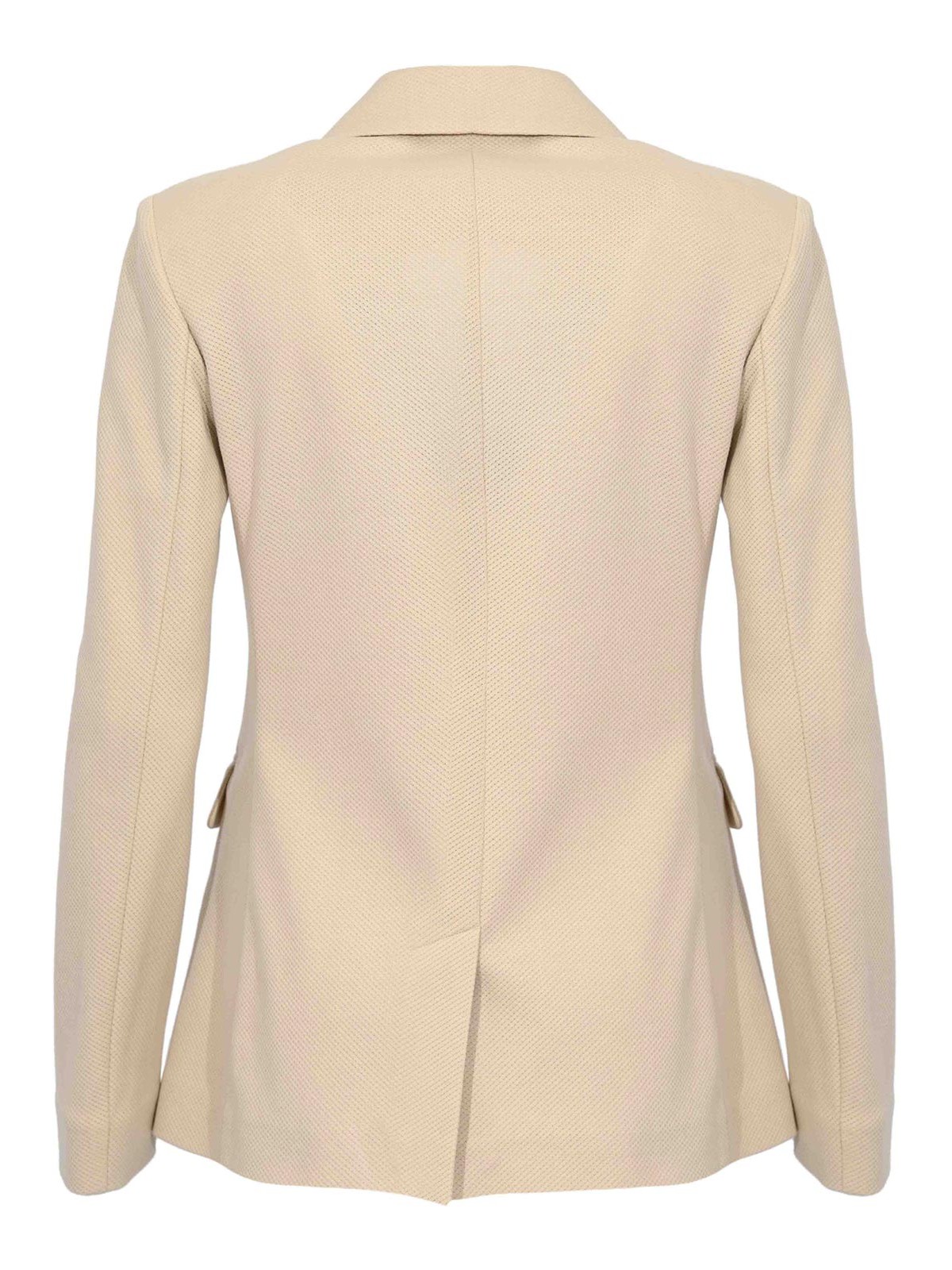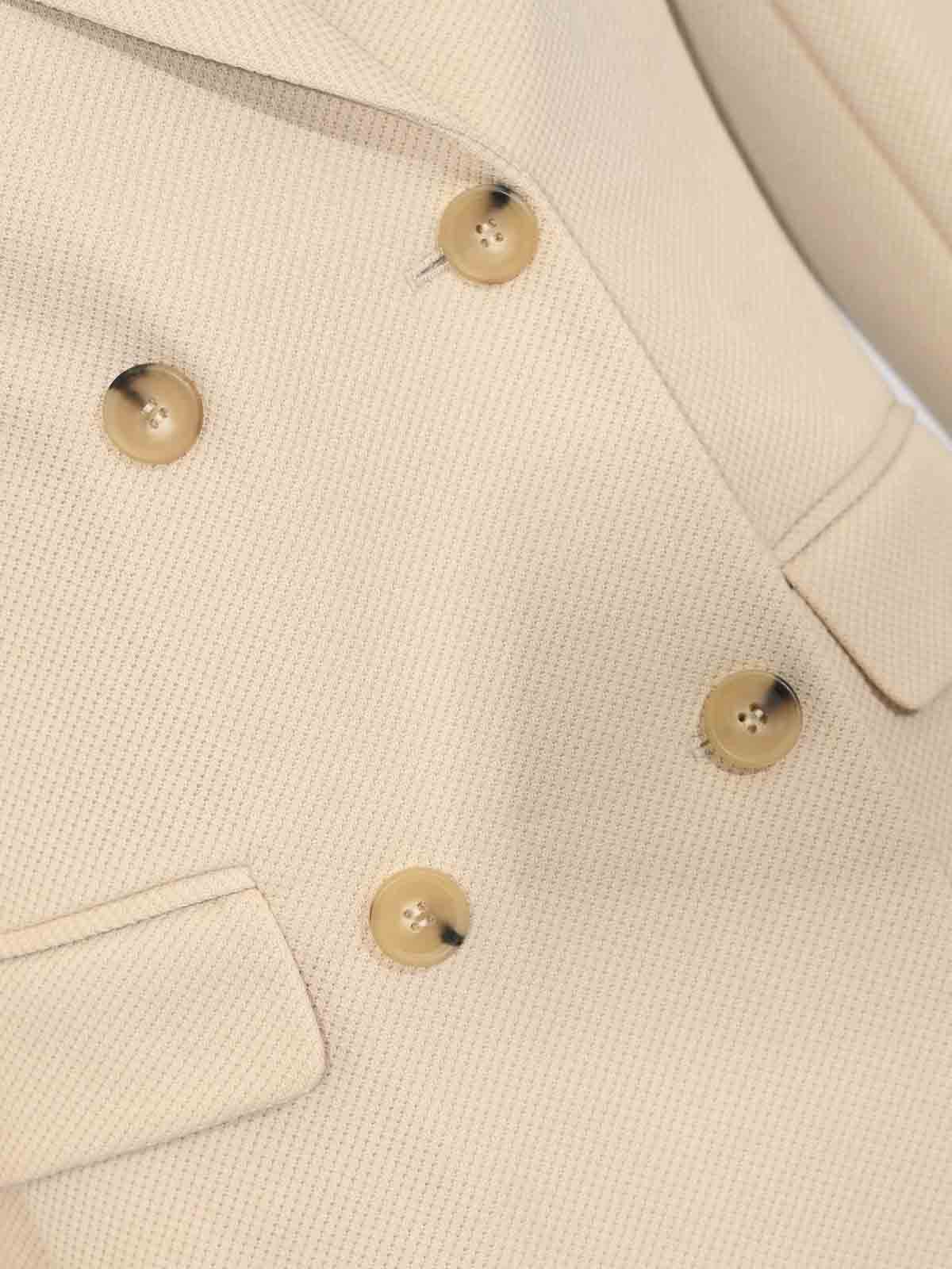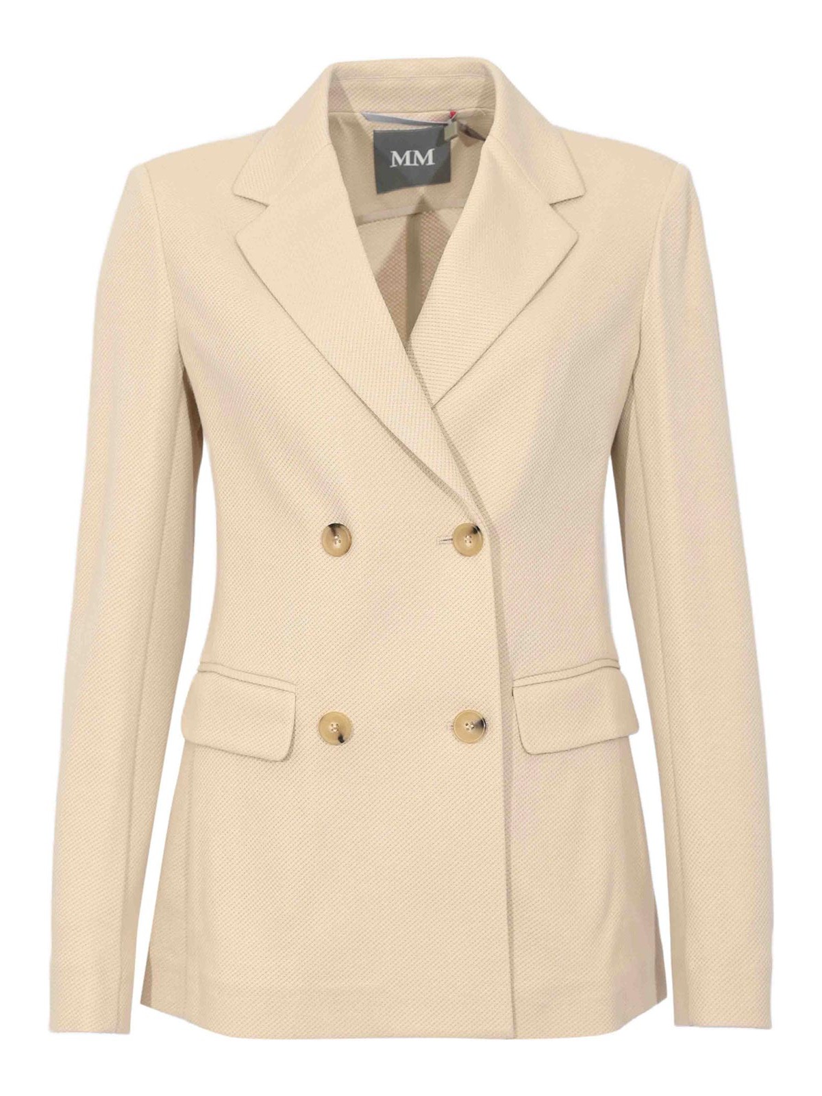 女性用ダブルブレストコットンピケジャケット、mm max mara、mmlrotondoモデル、生地:コットンピケ、パターン:無地、袖:ロング、襟:ラペル、クロージャー:ボタン付きダブルブレスト、ポケット:フロントフラップポケット2つ、ディテール:べっ甲エフェクトボタン、背面の中央通気口、ややテーパーライン、裏地:S、フィット:レギュラー