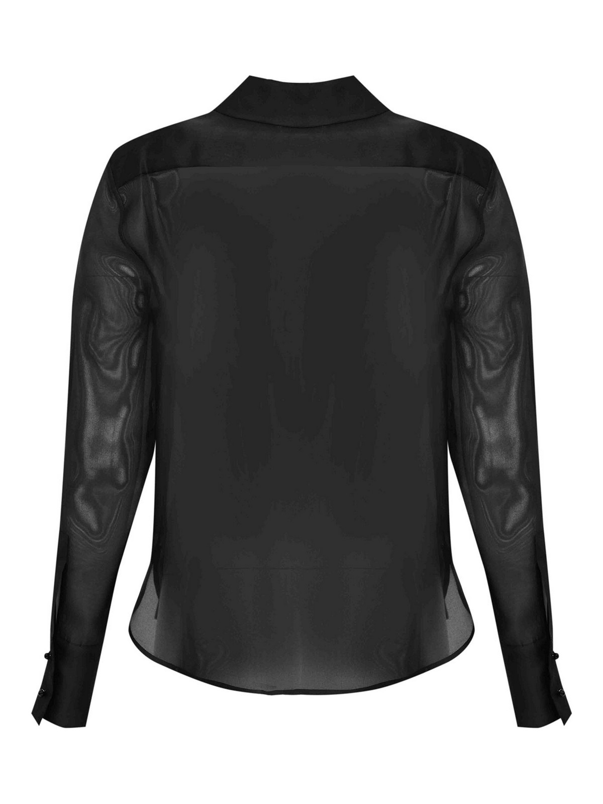 女性用シルクオーガンザシャツ、マックスマーラスタジオ、ムセギモデル、生地:シルクオーガンザ、柄:レリーフに花柄、袖:袖口付きロング、襟:クラシックなシャツスタイル、留め具:カバー付きフロントボタン、ポケット:なし、ディテール:半透明生地、立体加工を施した花、やや丸みを帯びたボトム、裏地:いいえ、フィット:レギュラー