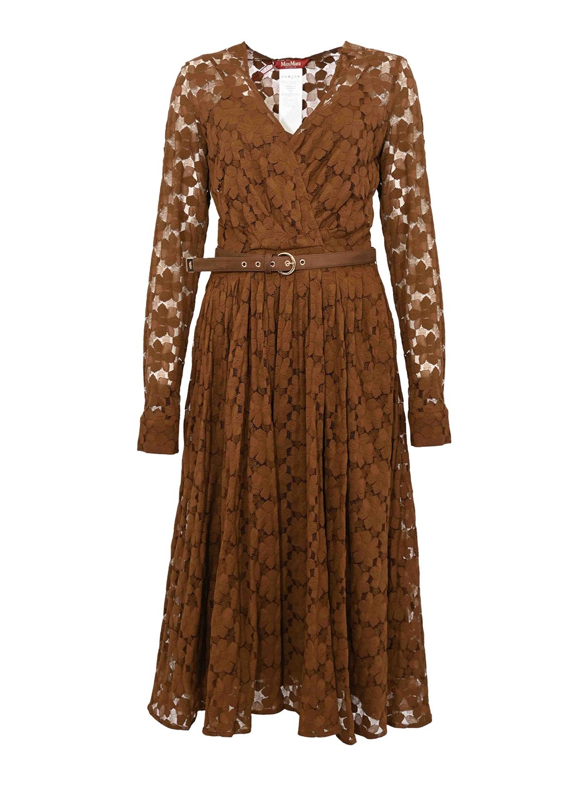 女性用チュールミディドレス、マックスマーラスタジオ、mstagrumeモデル、生地:花柄チュール、パターン:トーン・オン・トーン・フローラル、袖:ロング、襟:クロスVネック、ポケット:サイドウェルト、ディテール:メタルリングバックル付きコーディネートベルト、プリーツスカート、ドレープボディス、袖にセミシアーエフェクト、裏地:S、フィット:レギュラー
