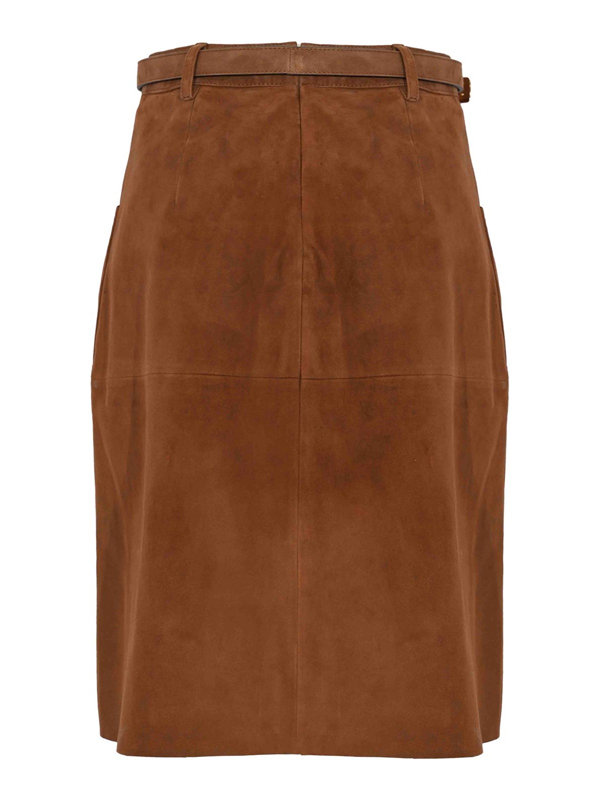 女性用スエードスカート、マックスマーラスタジオ、MSTテニスモデル、生地:スエード、パターン:ソリッドカラー、ウエスト:ベルトループとコーディネートベルト付き、クロージャー:リアジッパー、ポケット:フロントパッチ、長さ:ミディ、ディテール:縦ステッチのパネルとメタルバックル付きベルト、裏地:S、フィット:レギュラー、ストレートライン