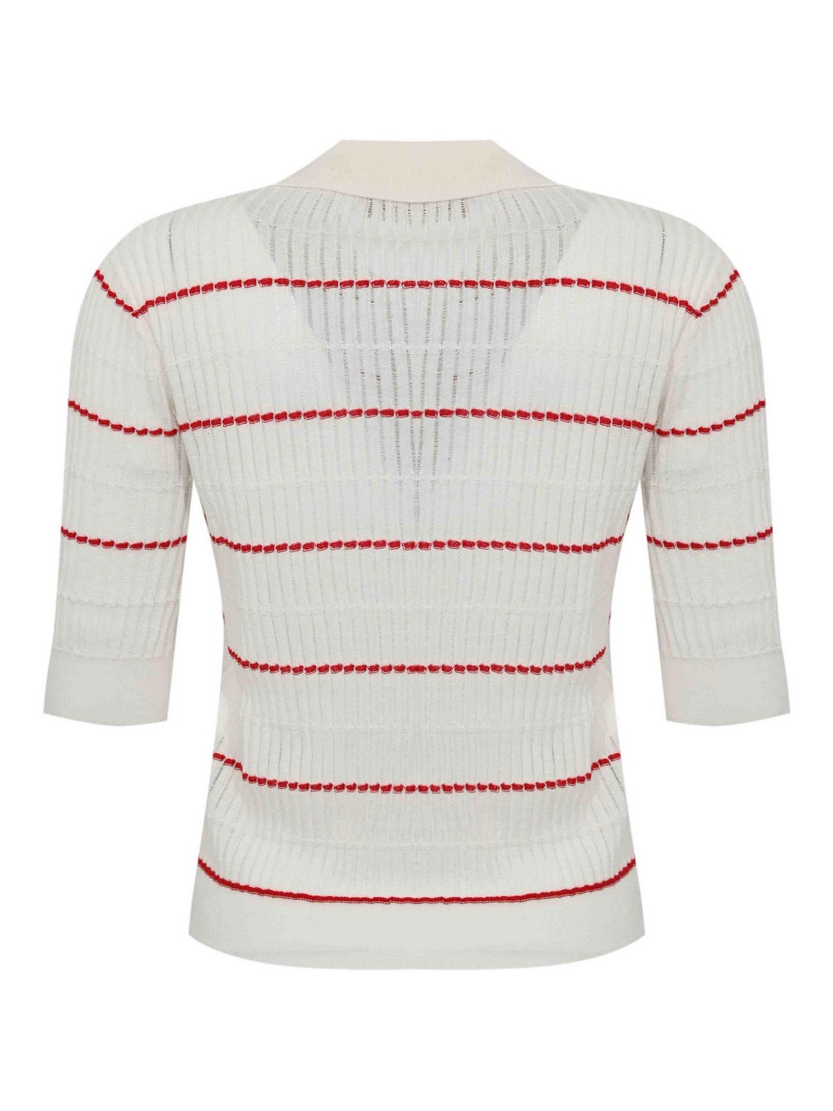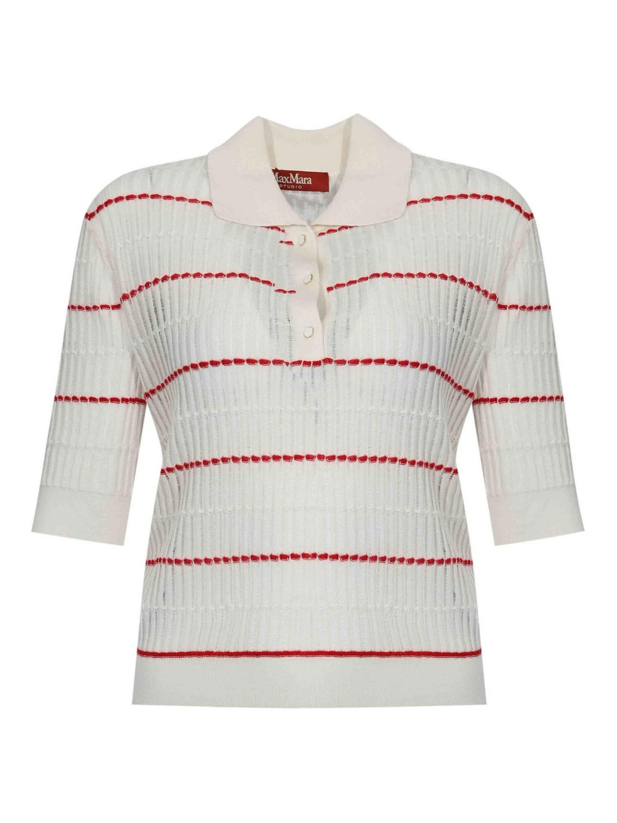 ウールとシルク糸の女性用セーター、マックスマーラスタジオ、mstgalloモデル、生地:ウールとシルク糸のセーター、パターン:対照的な水平ストライプ、袖:裾はリブ編み、襟:襟とボタンが開いたポロシャツ、クロージャー:前面にボタン付き、ポケット:なし、ディテール:穴あきリブ編みの仕上がり、ボトムとそりにリブ編みのプロファイル袖部分、裏地付き:なし、フィット:レギュラー