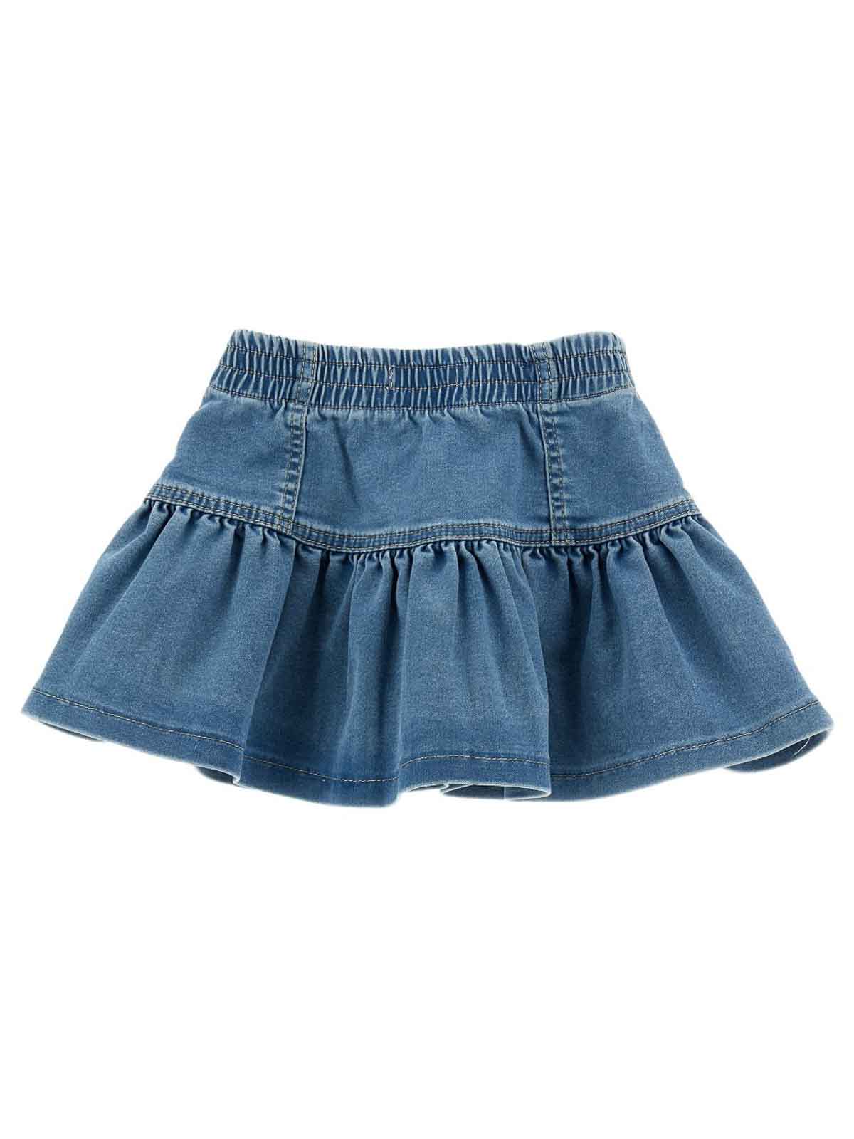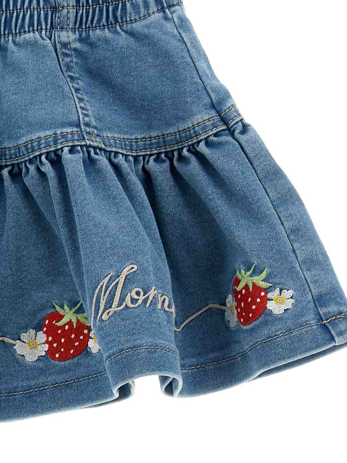 ブルーが特徴のデニムスカート。ストロベリーのロゴが刺繍され、フリル付きでウエストは伸縮性があります。