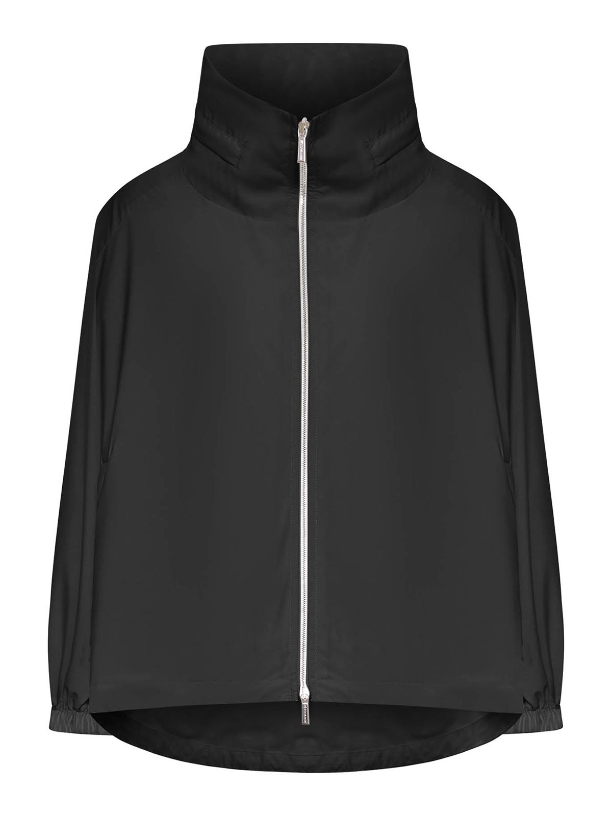 高めのラップアラウンドカラー、フルレングスのオープンジッパー付きフロントクロージャー、伸縮性のある袖口付きのロングスリーブ、丸みを帯びた裾のややフレアフィット、軽量で高性能なテクニカルファブリック、滑らかでコンパクトな防風素材、レギュラーフィット、カラー:ブラック