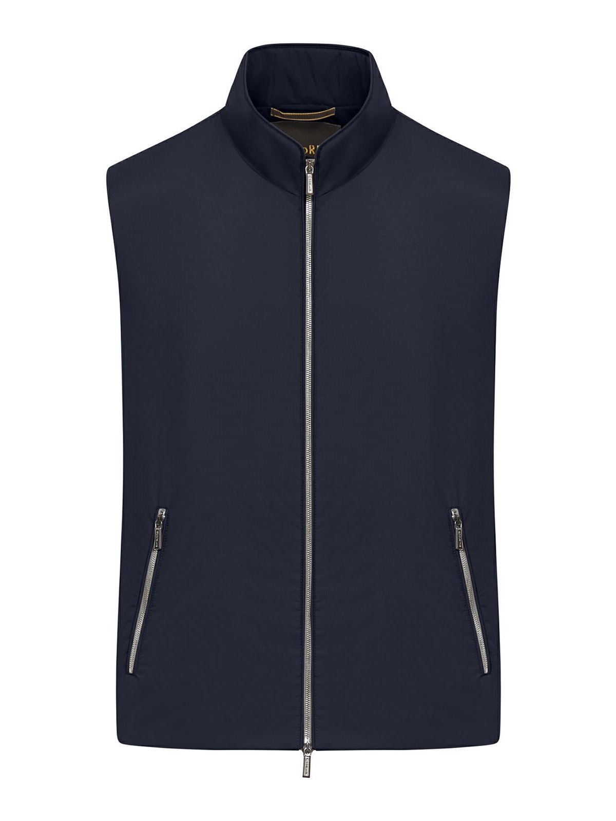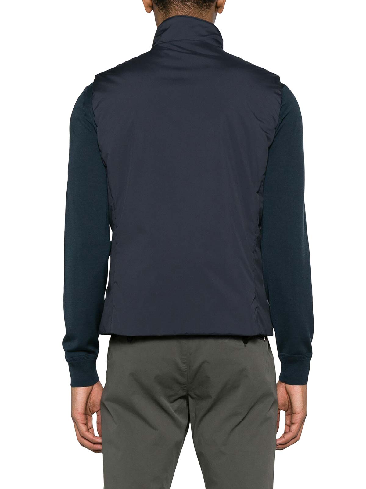パッド入りデザイン、ハイネック、ノースリーブ、サイドファスナーポケット2つ、ストレートヘム、2ウェイジップフロントクロージャー、カラー:ブルー