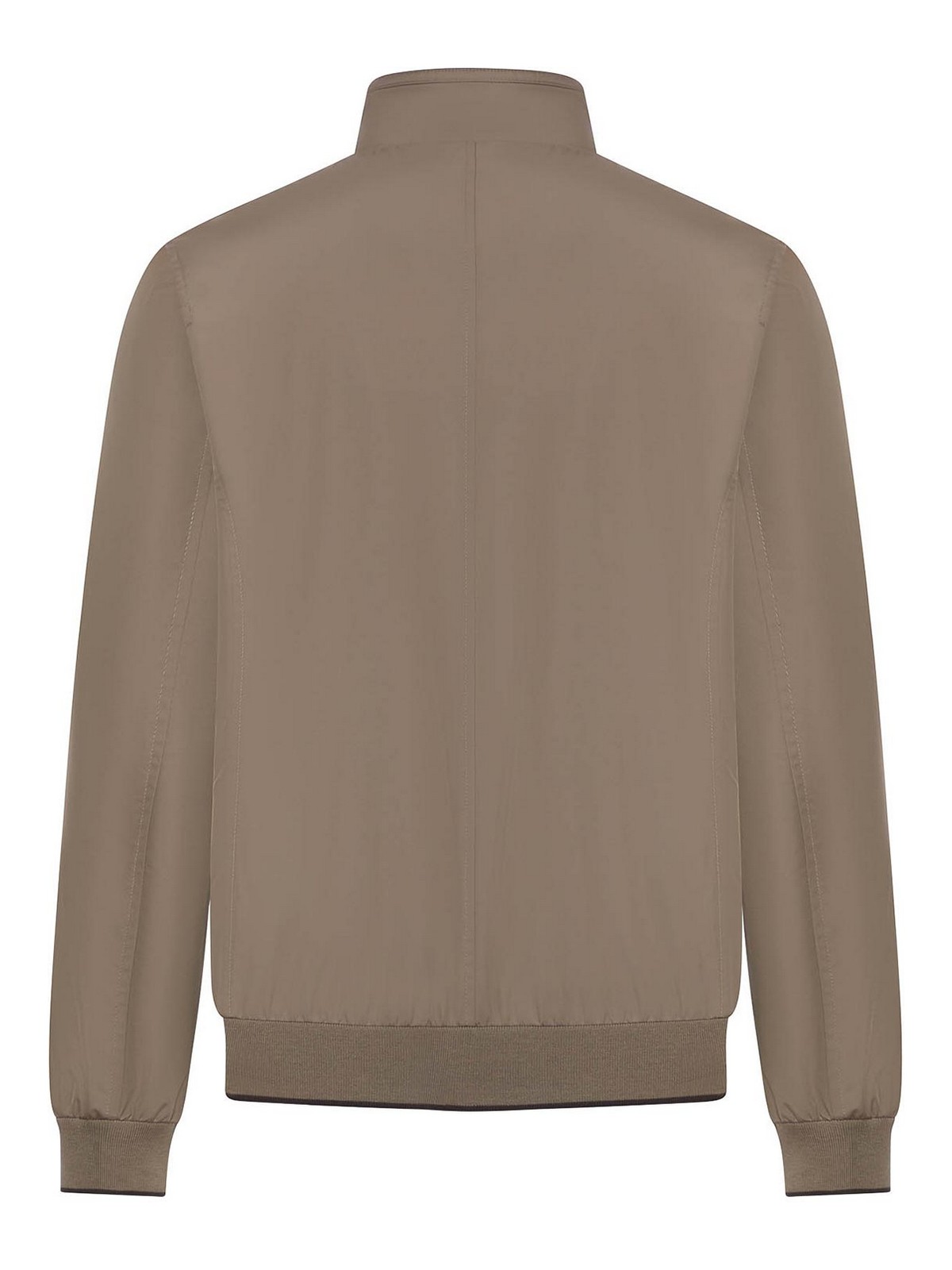 ボンバージャケット、滑らかで軽量なテクニカルファブリック製、コントラストの効いた裏地付きのハイカラー、フルレングスのメタルジッパー付きフロントクロージャー、サイドジッパーポケット、伸縮性のあるリブ編みの裾と袖口、すっきりとしたラインとミニマルなシルエット、レギュラーフィット、色:ミンク