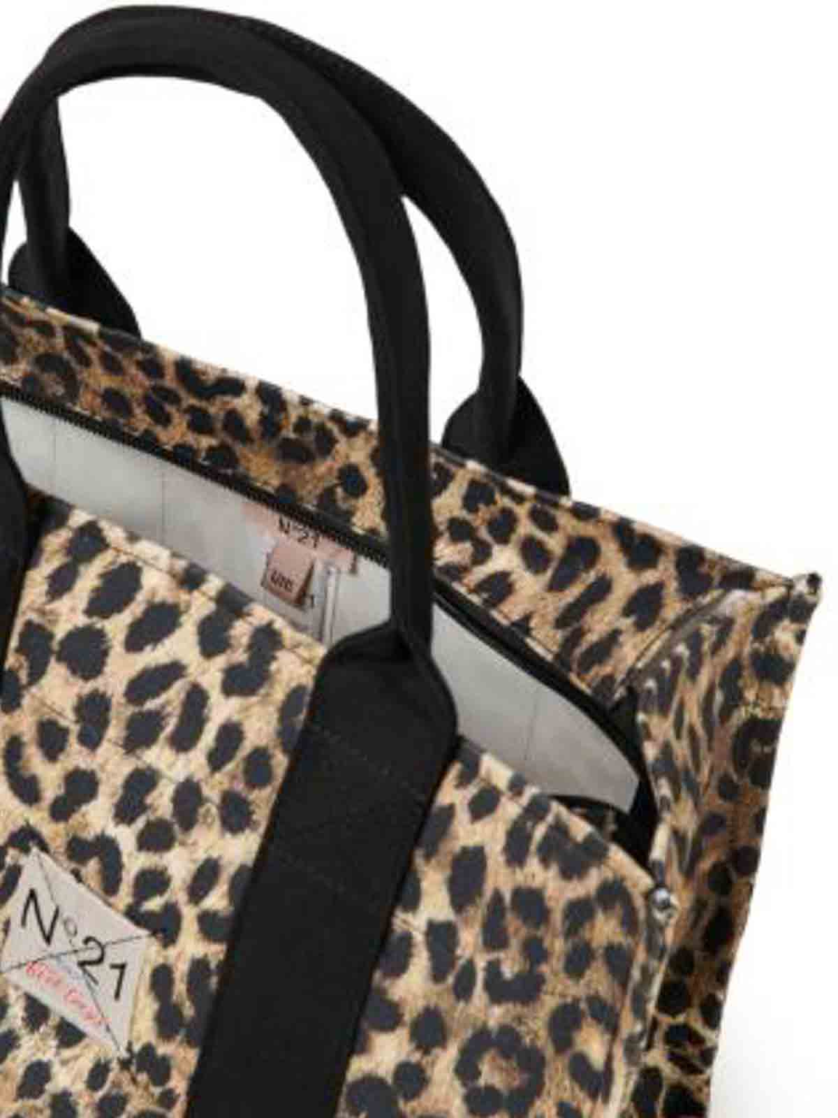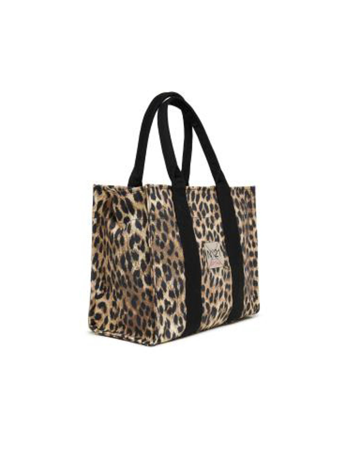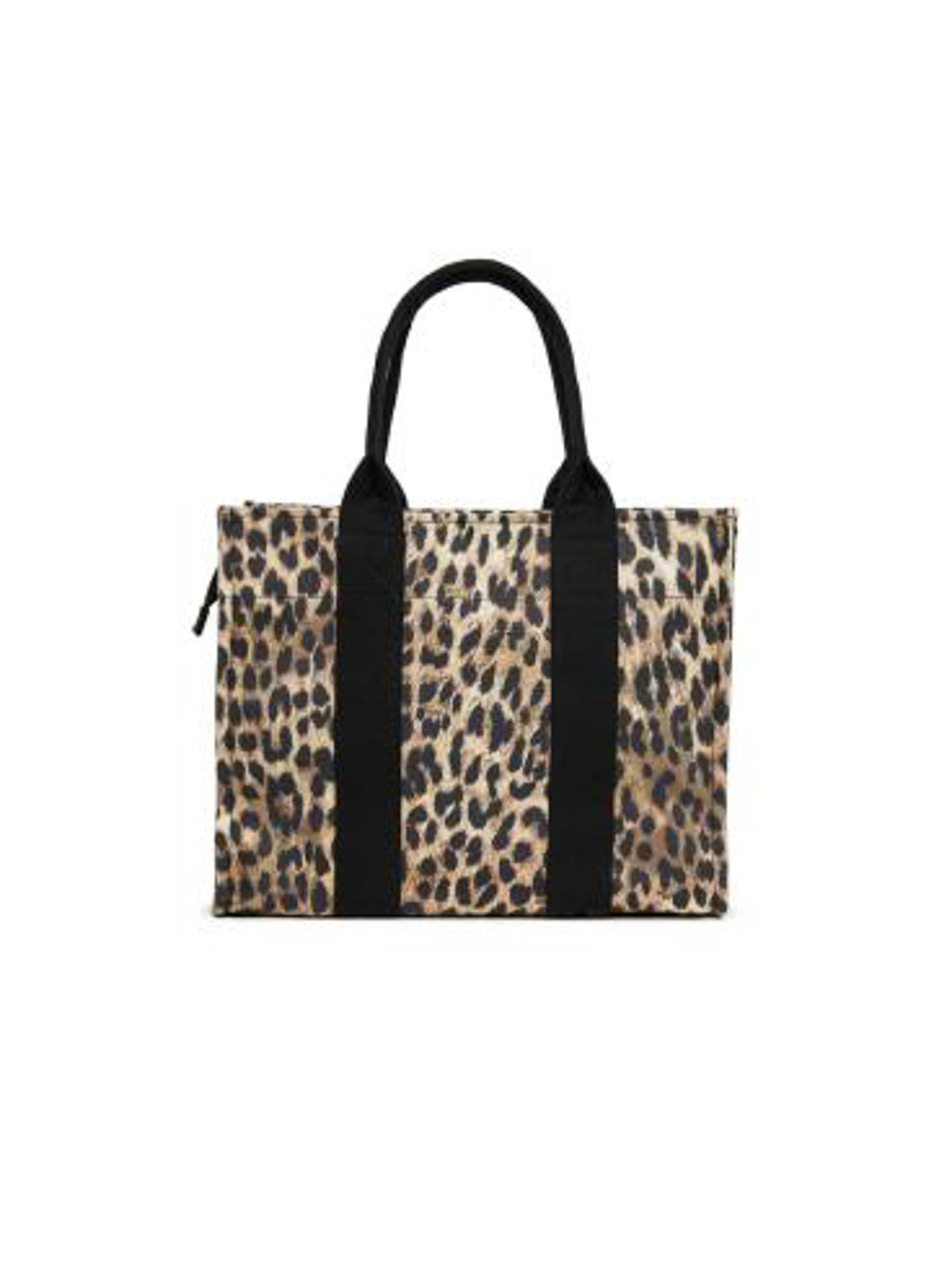 ライトブラウンのアニマル柄バッグ、ヒョウ柄、ロゴ入りハンドル、ジッパー