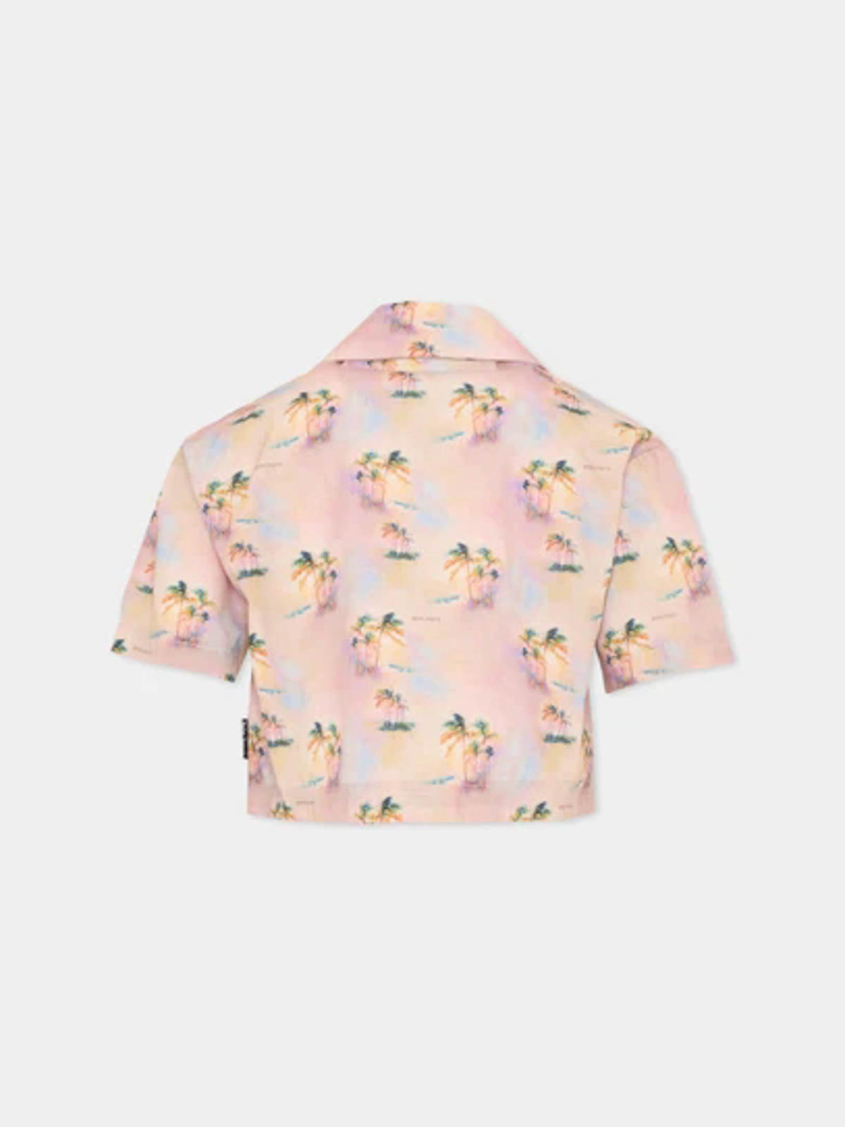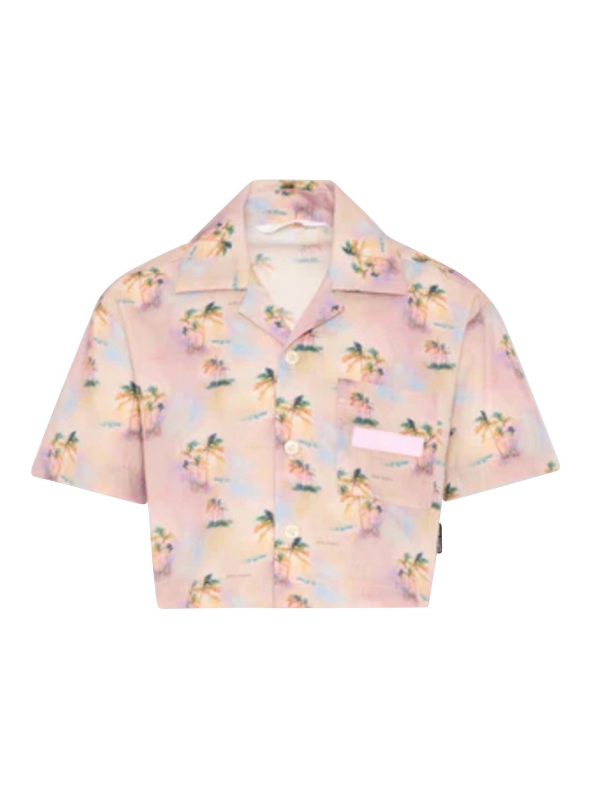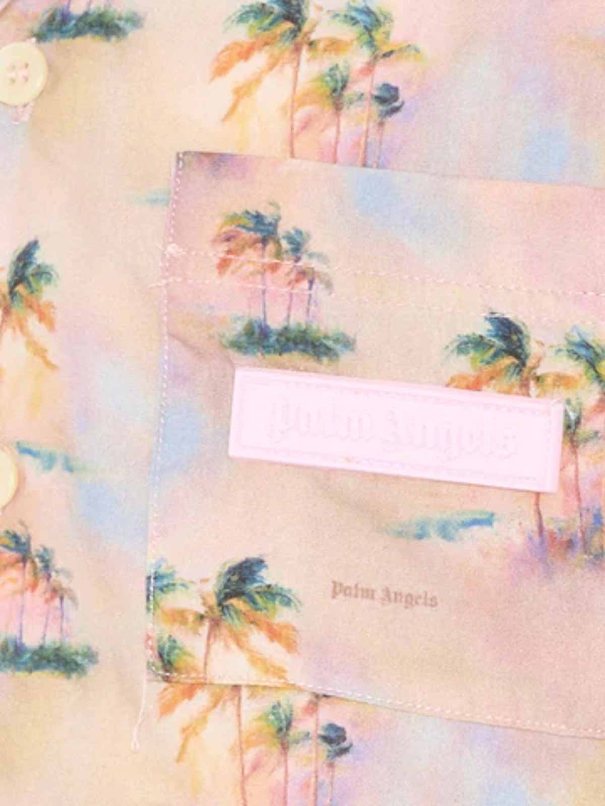 パームエンジェル付きシャツツイルプリントショートシャツ、ヤシの木と夕日のプリントが全面に施されています