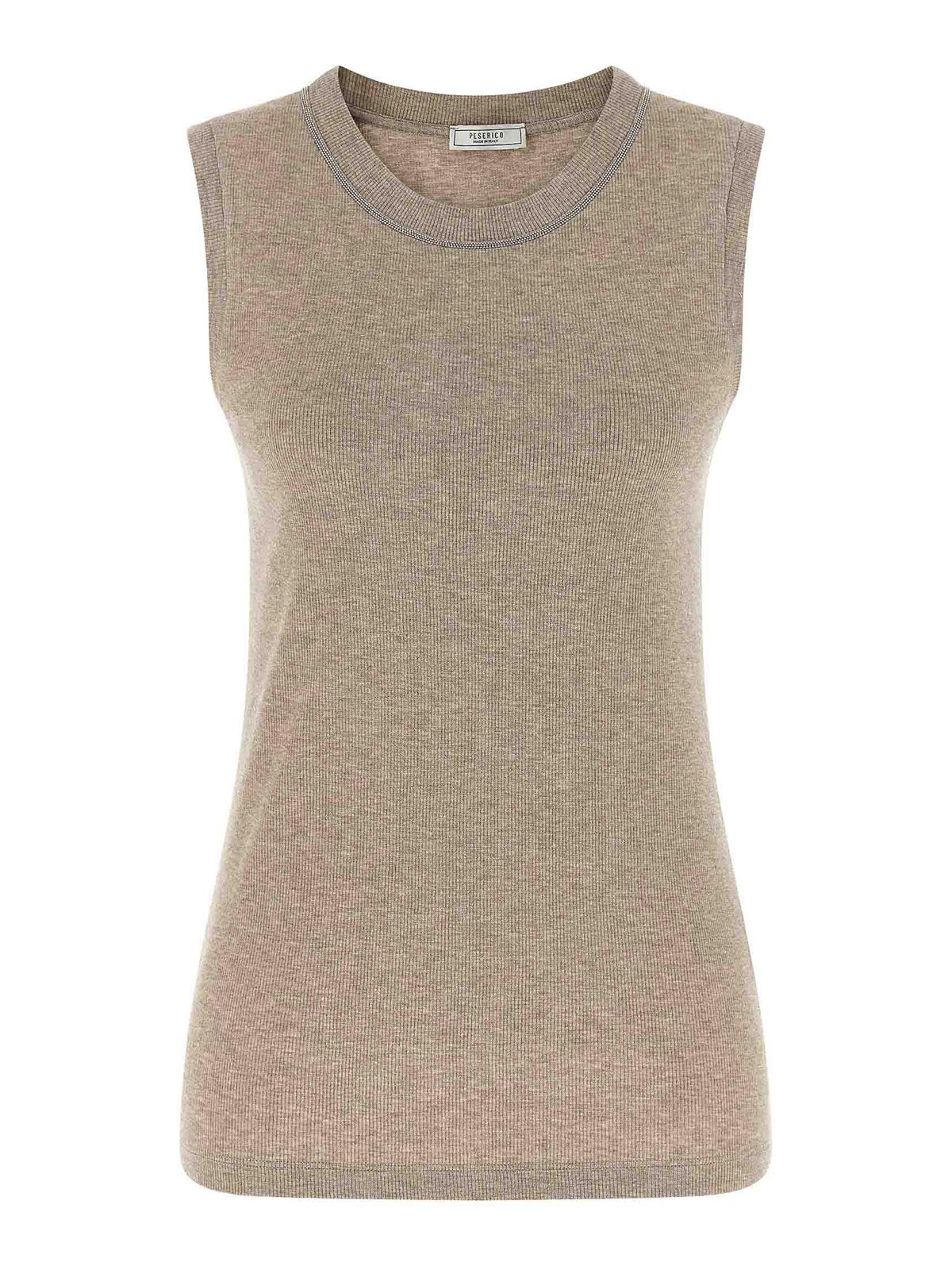 ラムスレッドで織られたリブ編みのビスコーストップ、メタルの「プントルース」をあしらったクルーネック。