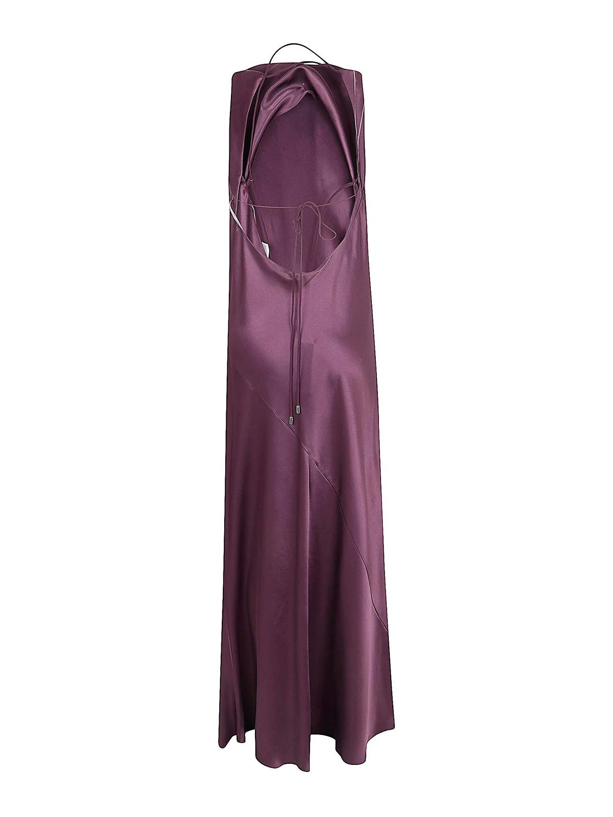 PINKOのソフトで光沢のあるダブルフェイスのスペルドレス。フロントのネックラインはソフトなドレープ、バックは幅広のラウンドネックラインで、体の形に合わせてデザインの中央に2本のリボンで結びます。