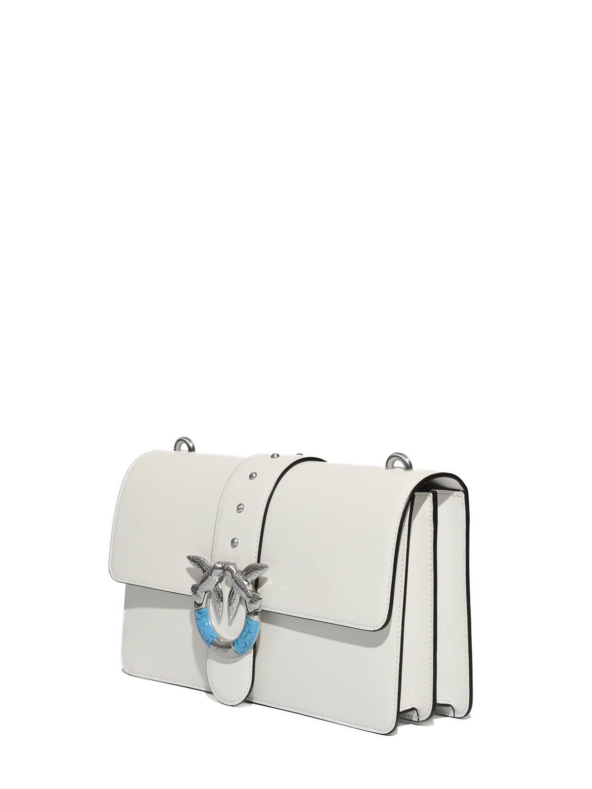 レザーショルダーバッグ、ピンコ、ラブバッグワンモデル、素材:スムースレザー、パターン:ソリッドカラー、クロージャー:メタルとターコイズインサートのアイコニックなラブバードバックル付きフラップ、ハンドル/ショルダーストラップ:レザーショルダーストラップ付きチェーンショルダーストラップ、調節可能、ポケット:多機能インナーポケット、ディテール:ターコイズインサート付きシルバーメタルのラブバードバックル、目に見えるステッチ、メタル仕上げ、裏地:S、容量:ミディアム、フィット /持ち運びやすさ:オーバーショルダー、オーバーショルダー