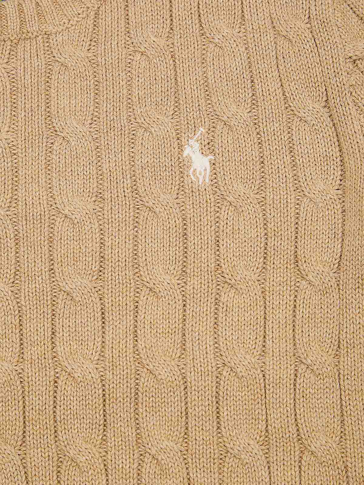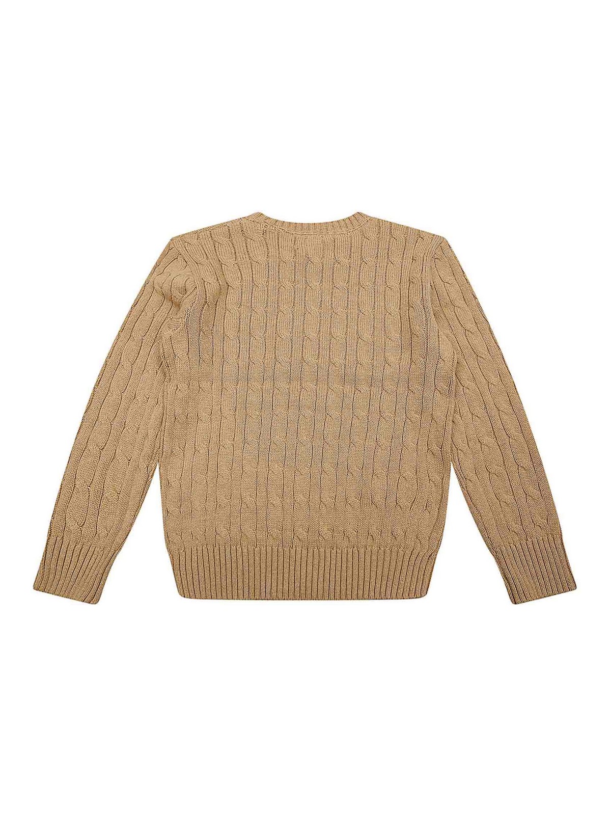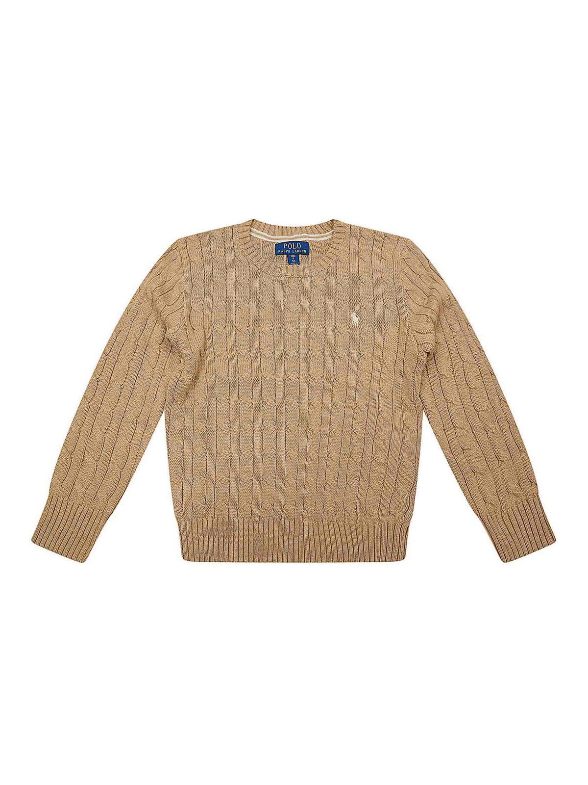 Ralph Lauren Kidsのケーブル付きMorivoコーマ糸セータークルーネックロングスリーブ。裾と襟にリブ編みの袖口が付いており、胸の左側にポニーの刺繍が施されています。