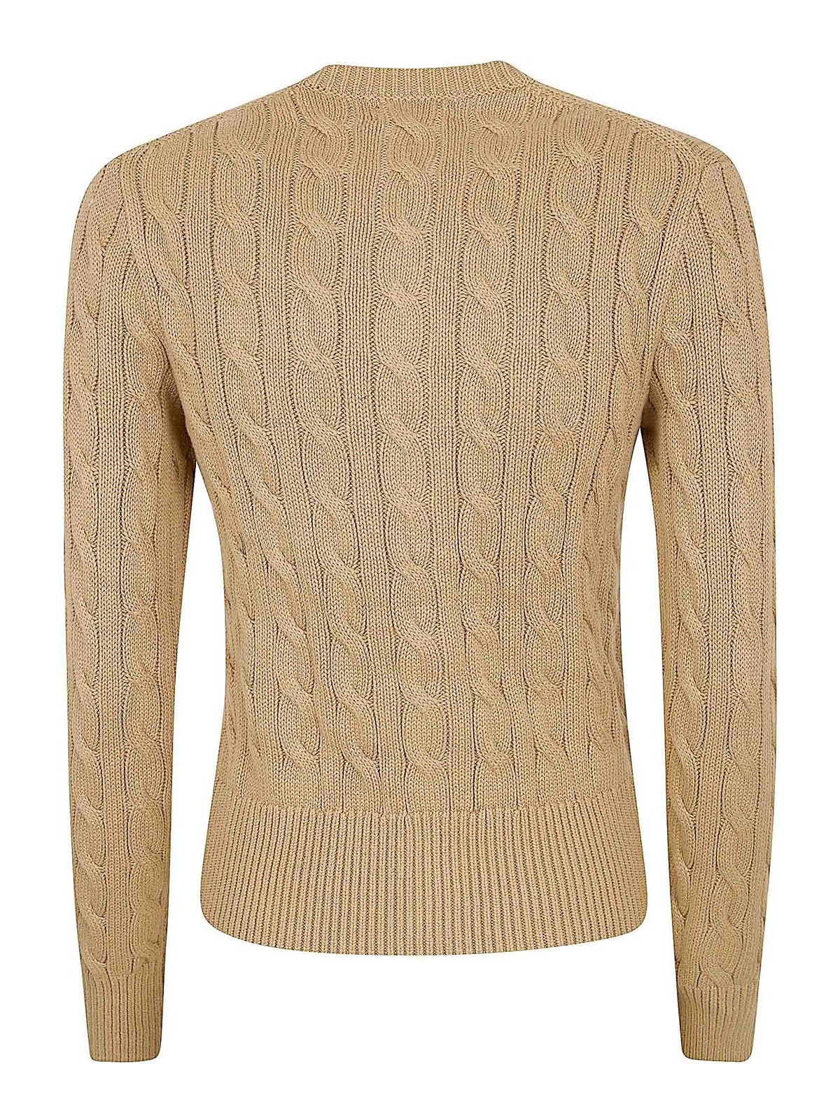 クラシックなポロラルフローレンのケーブルニット、クルーネック、ロングスリーブ、クルーネックカフス、ボタンとグロスグレイン仕上げのリブ編みのヘムをあしらったピュアカーディガン。タイトフィット。胸の左側に高級ポニーが刺繍されているのが特徴のヒップレングスデザイン