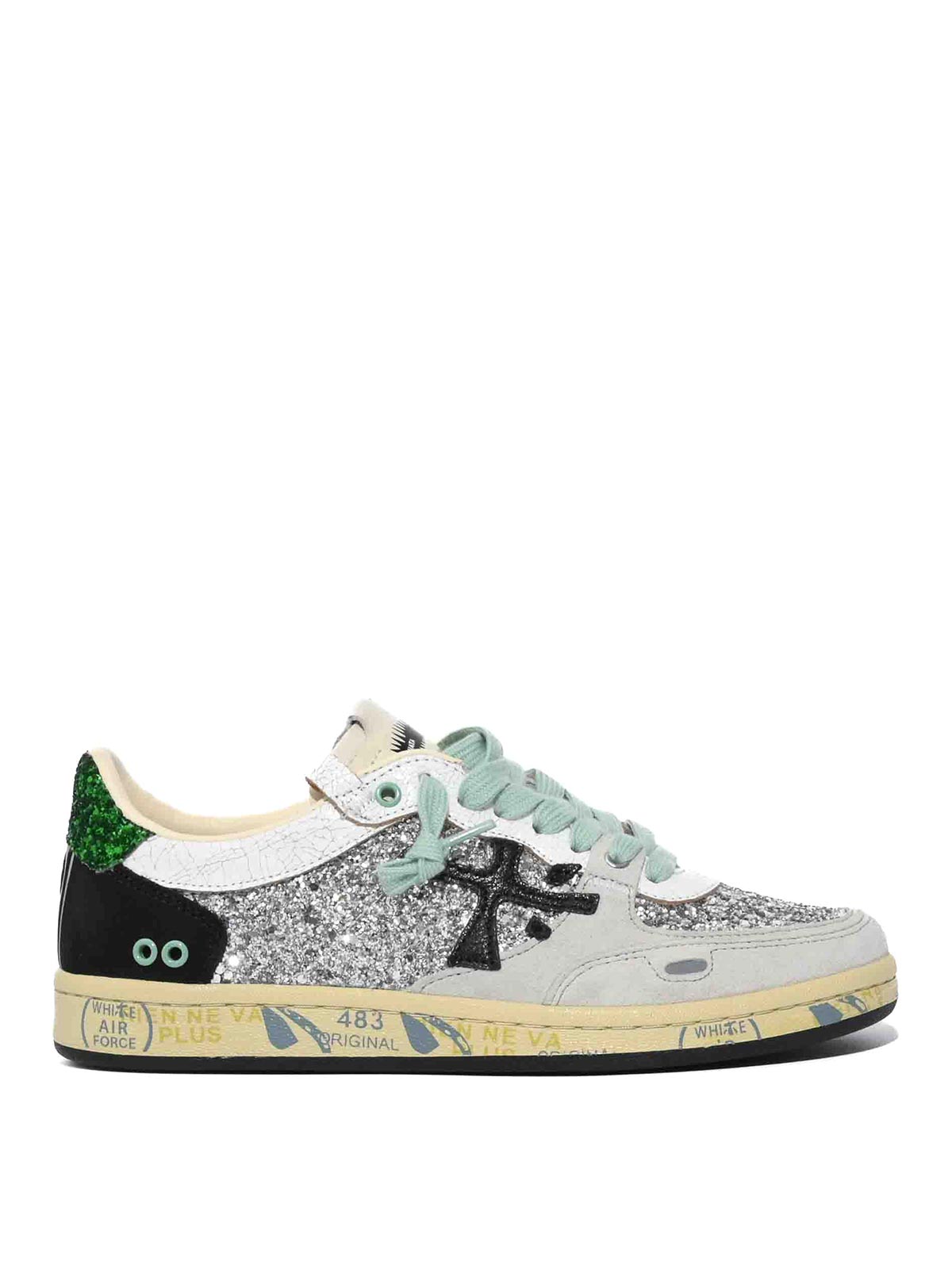 女性用レザースニーカー、Premiata、bskt clayd 8165モデル、アッパー:グリッターとスエードをあしらったレザーとファブリックインサート、横にPremiataロゴ入り、クロージャー:フラットレース、ソール:ハニーカラーのトレッドをあしらったラバーソールとアイコニックなPremiataグラフィックをあしらったミッドソール、詳細:グリッタートゥのバスケットボールスニーカーにインスパイアされたデザイン、コントラストの効いたインサートとグリーンのグリッターをあしらったヒール、裏地:レザー、ヒール:やや盛り上がったソール約2.5cm